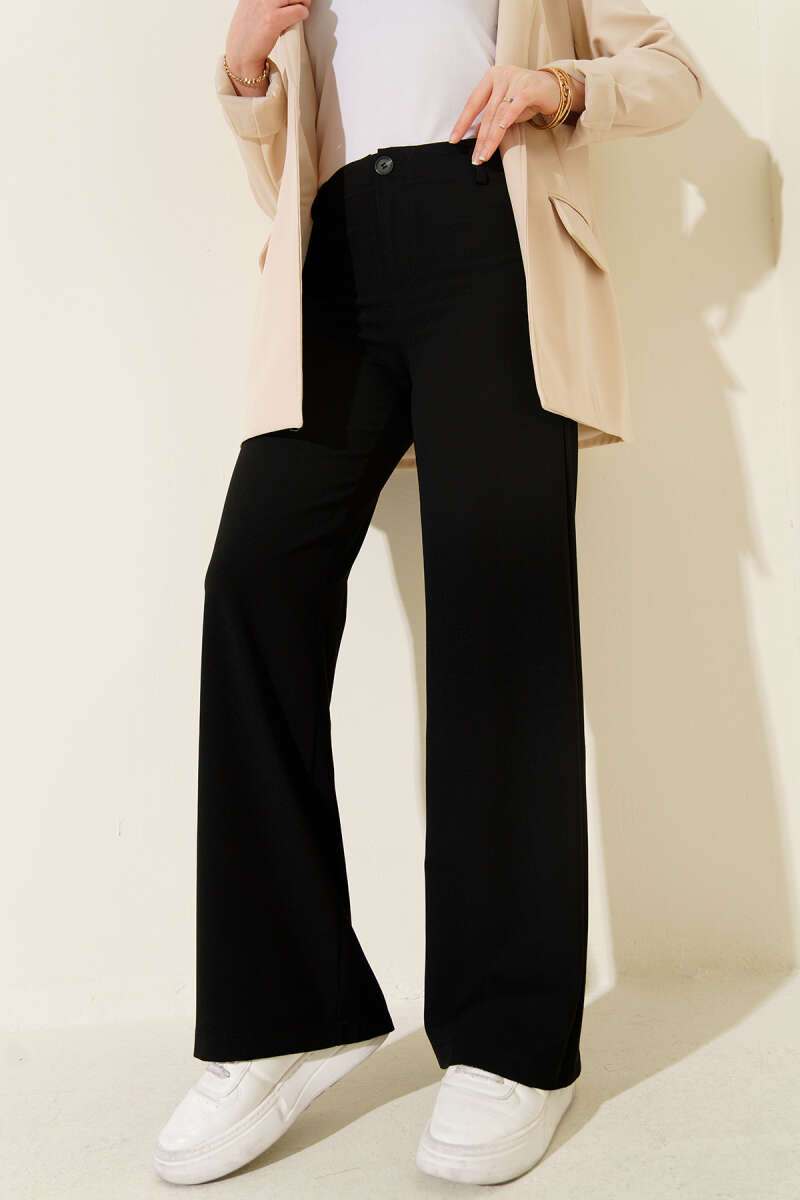 Geniş Paça Düğmeli Pantolon Siyah