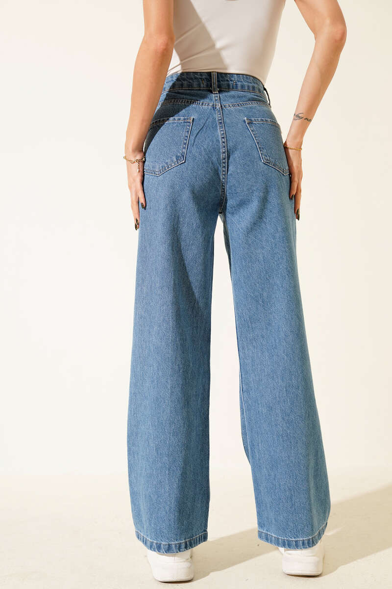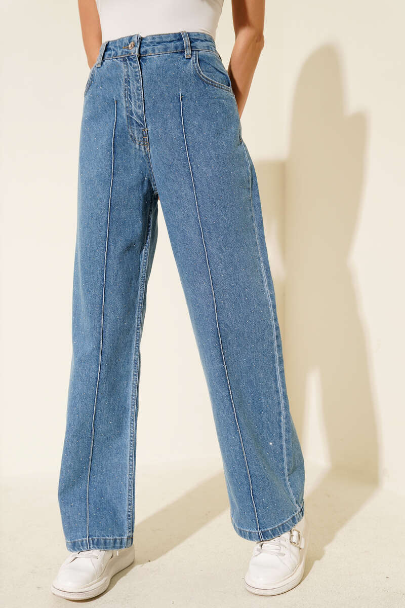 Geniş Paça Mini Taşlı Kot Pantolon Mavi