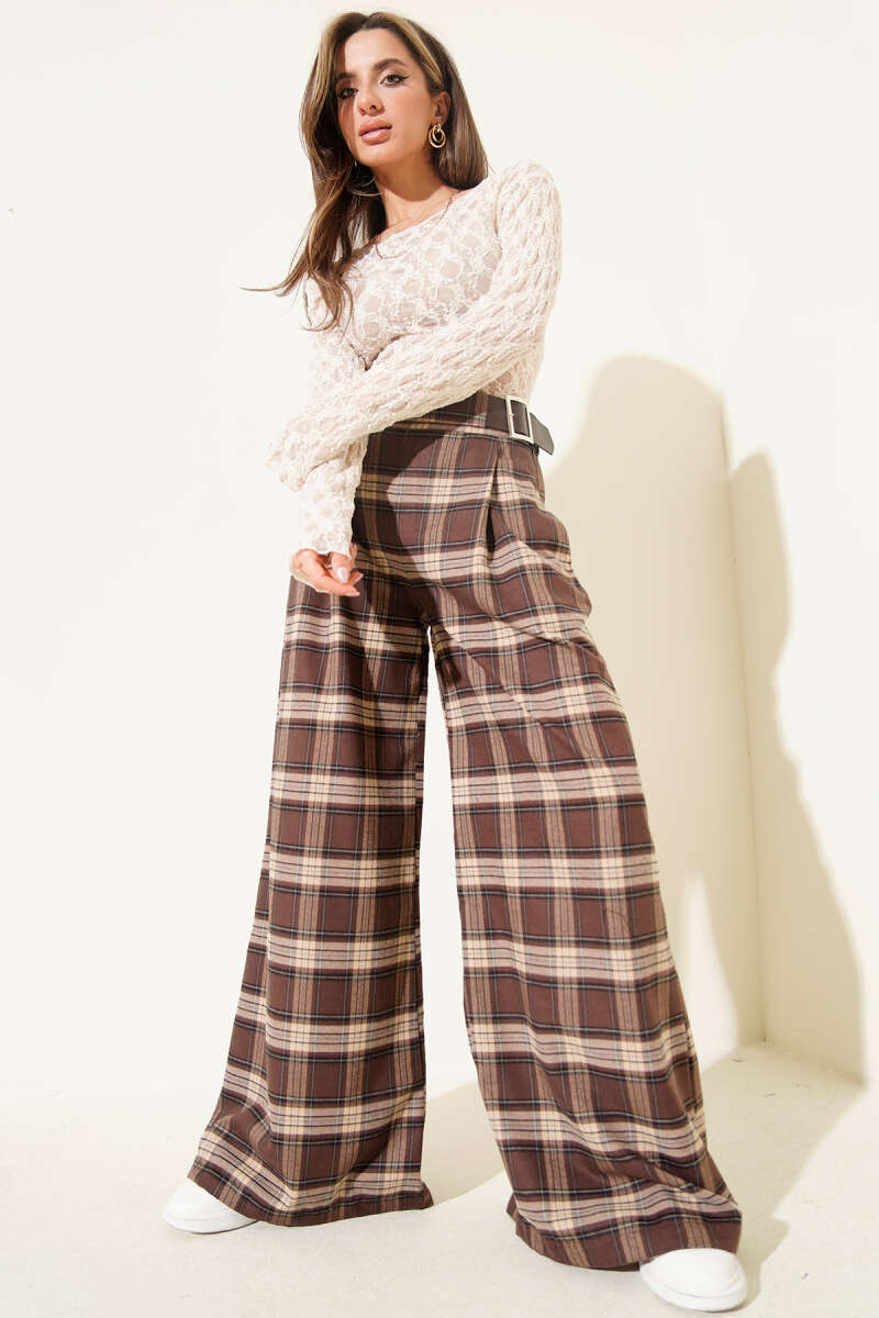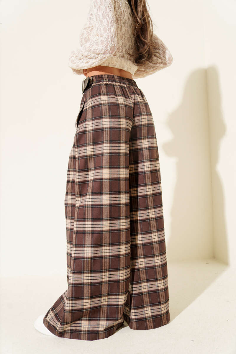 Geniş Paçalı Ekose Desen Pantolon Kahve