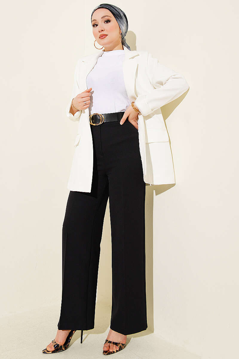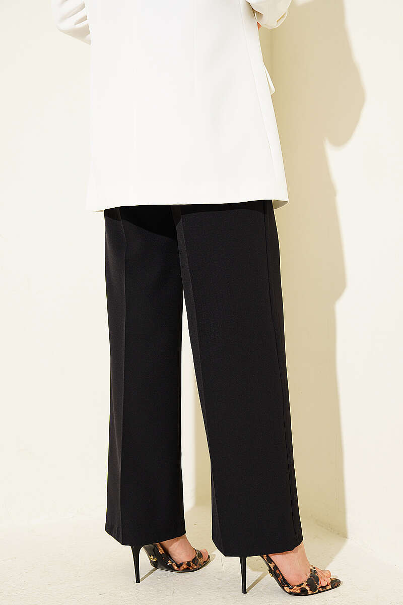 Kemerli Düğmeli Geniş Paça Pantolon Siyah