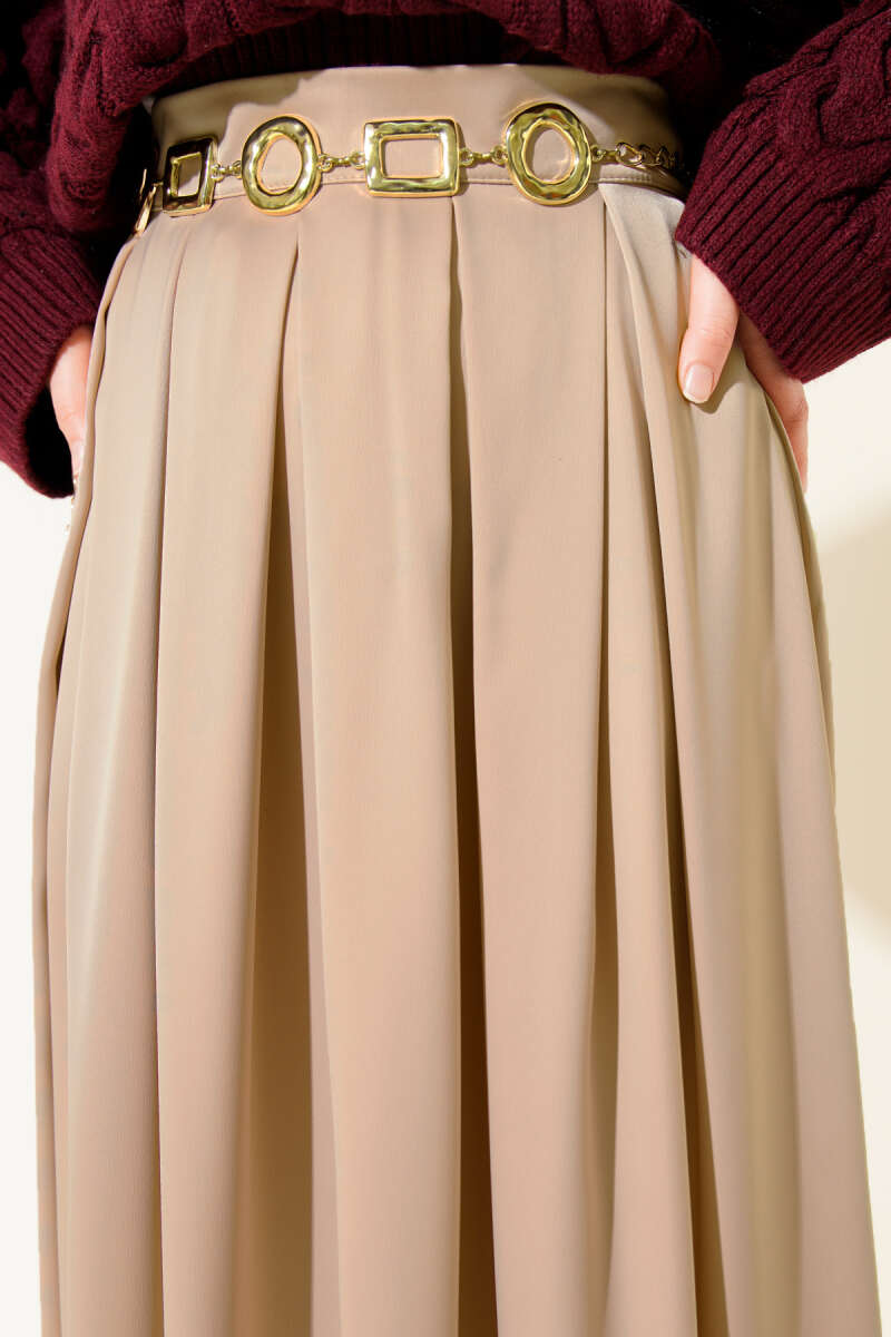 Geniş Pileli Saten Etek Kahve