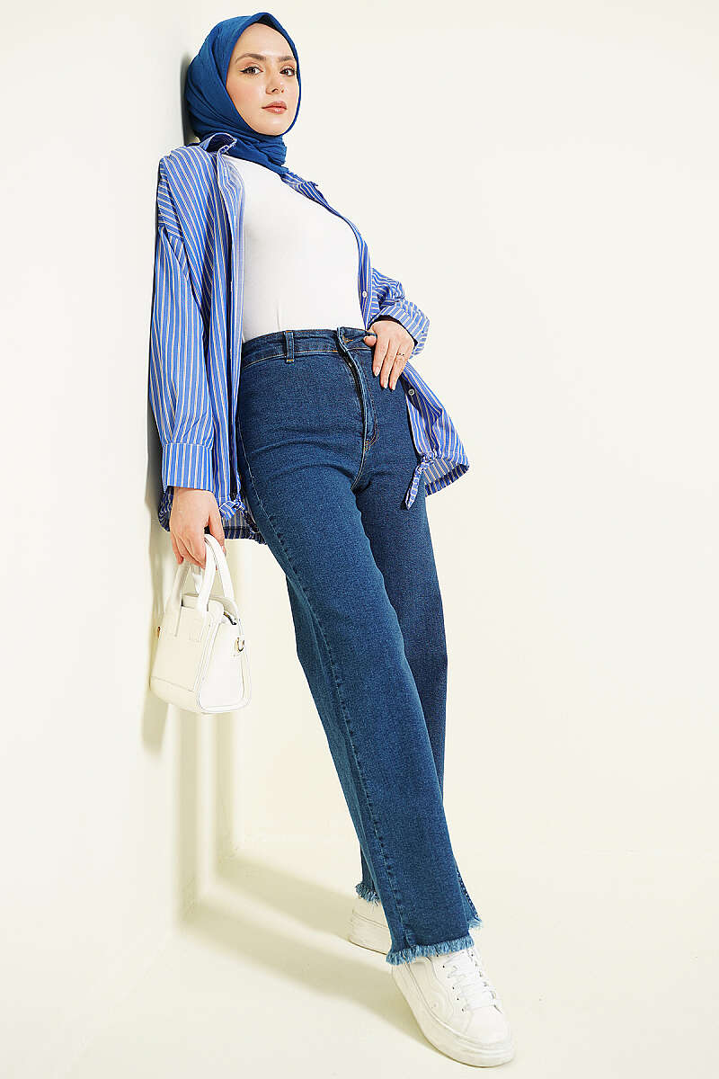 Geniş Püskül Paçalı Kot Pantolon Orta Kar