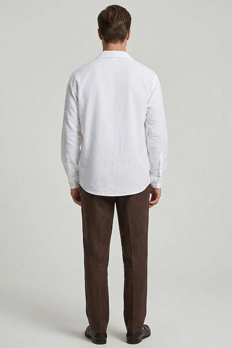 Manşet Düğmeli Çizgili Keten Erkek Gömlek Bej