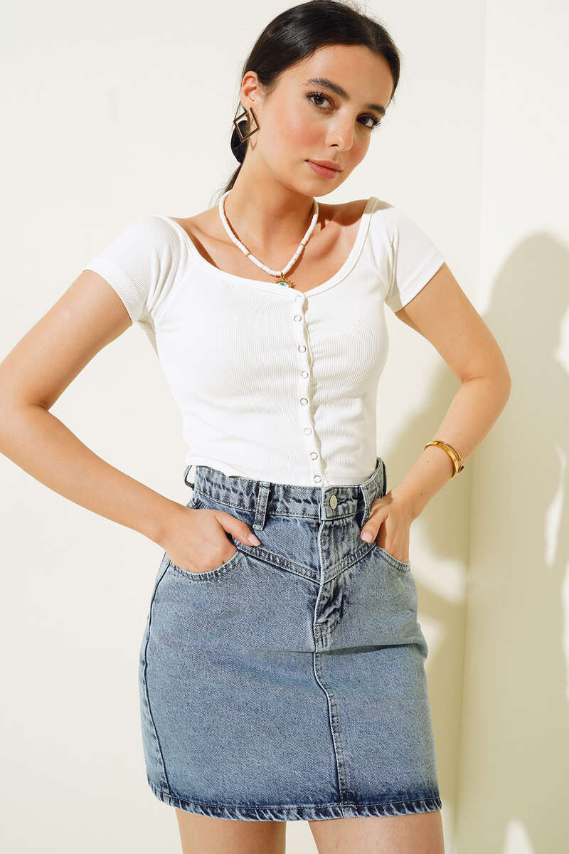 Yeni sezon bluzumuz çıtçıt düğme görünümlüdür. Çıtçıtlar süs olarak kullanılmıştır. Geniş yaka olan bluzumuz kısa koldur. şık ve sportif bir görünüme sahiptir.
