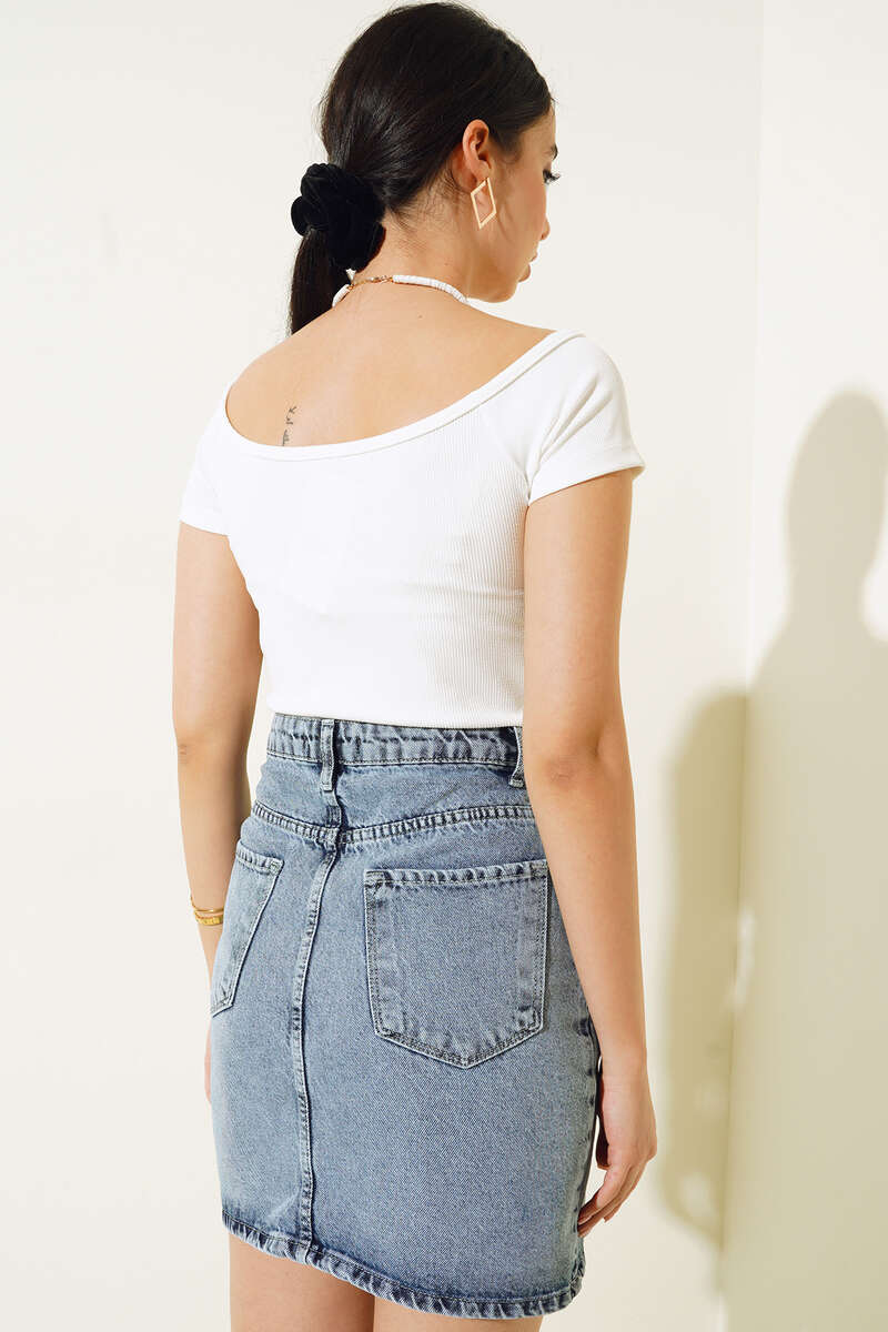 Geniş Yaka Çıtçıt Düğmeli Bluz Ekru