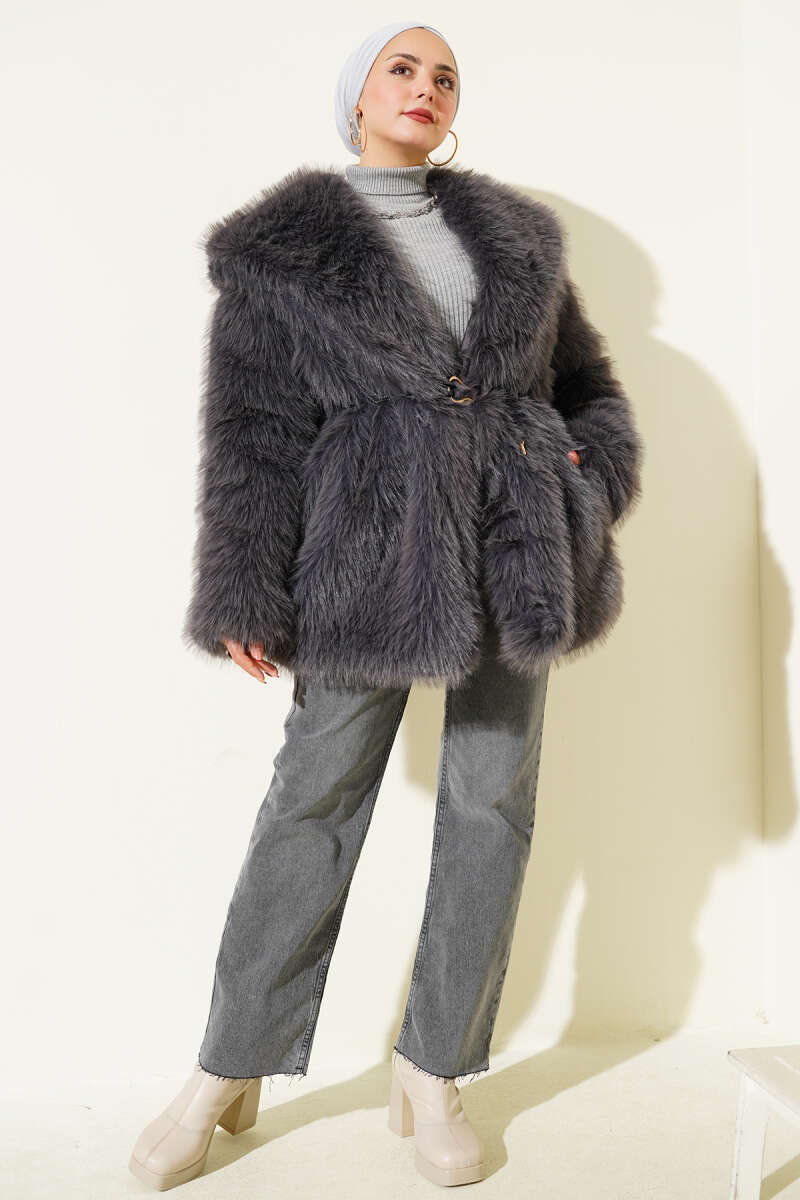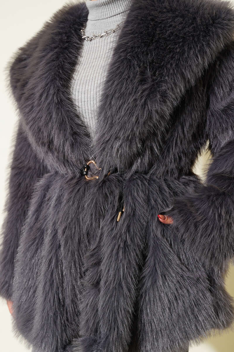 Madonna Yaka Kemerli Kürk Mont Siyah