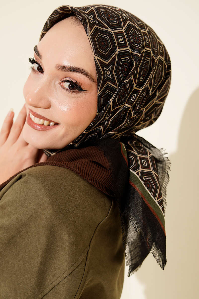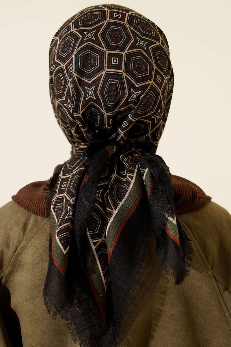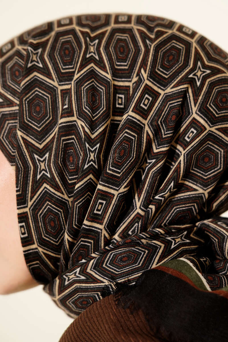 Geometri Desen Flamu Cotton Eşarp Siyah Haki