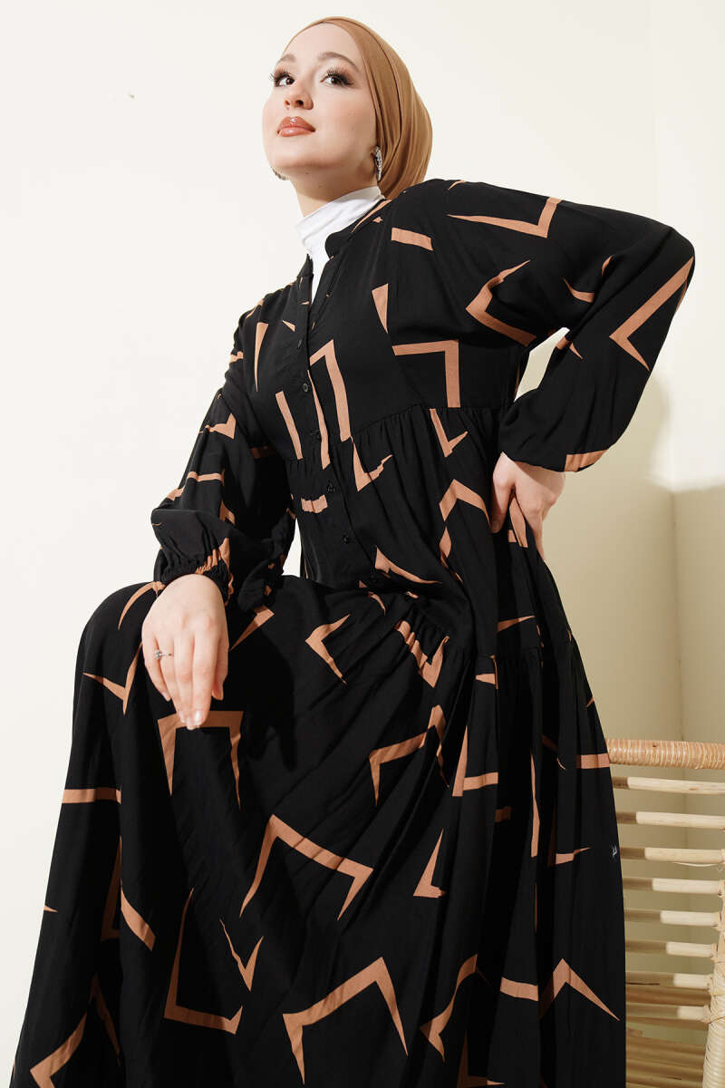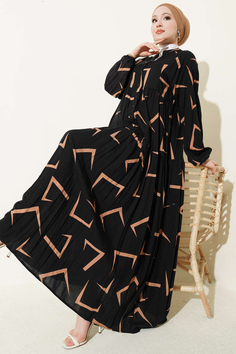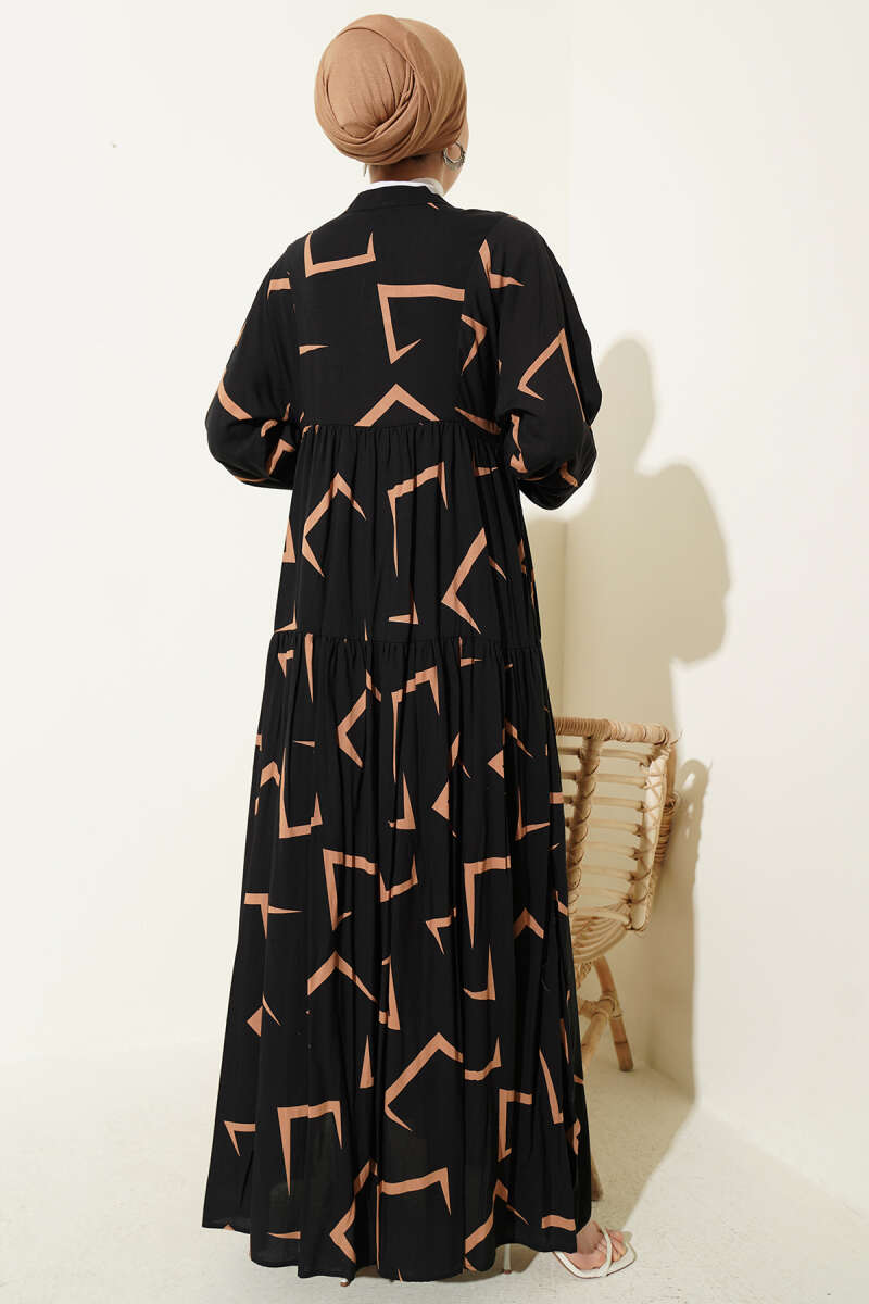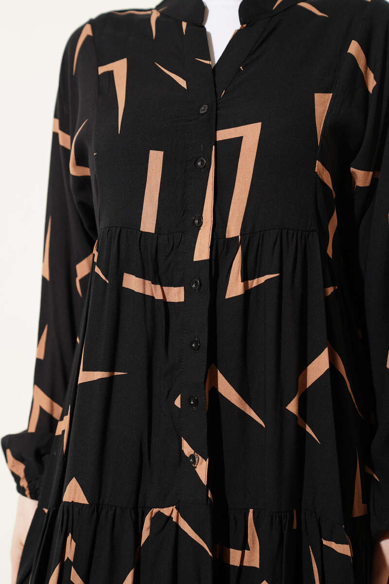 Düğmeli Etnik Desenli Katlı Elbise Bej