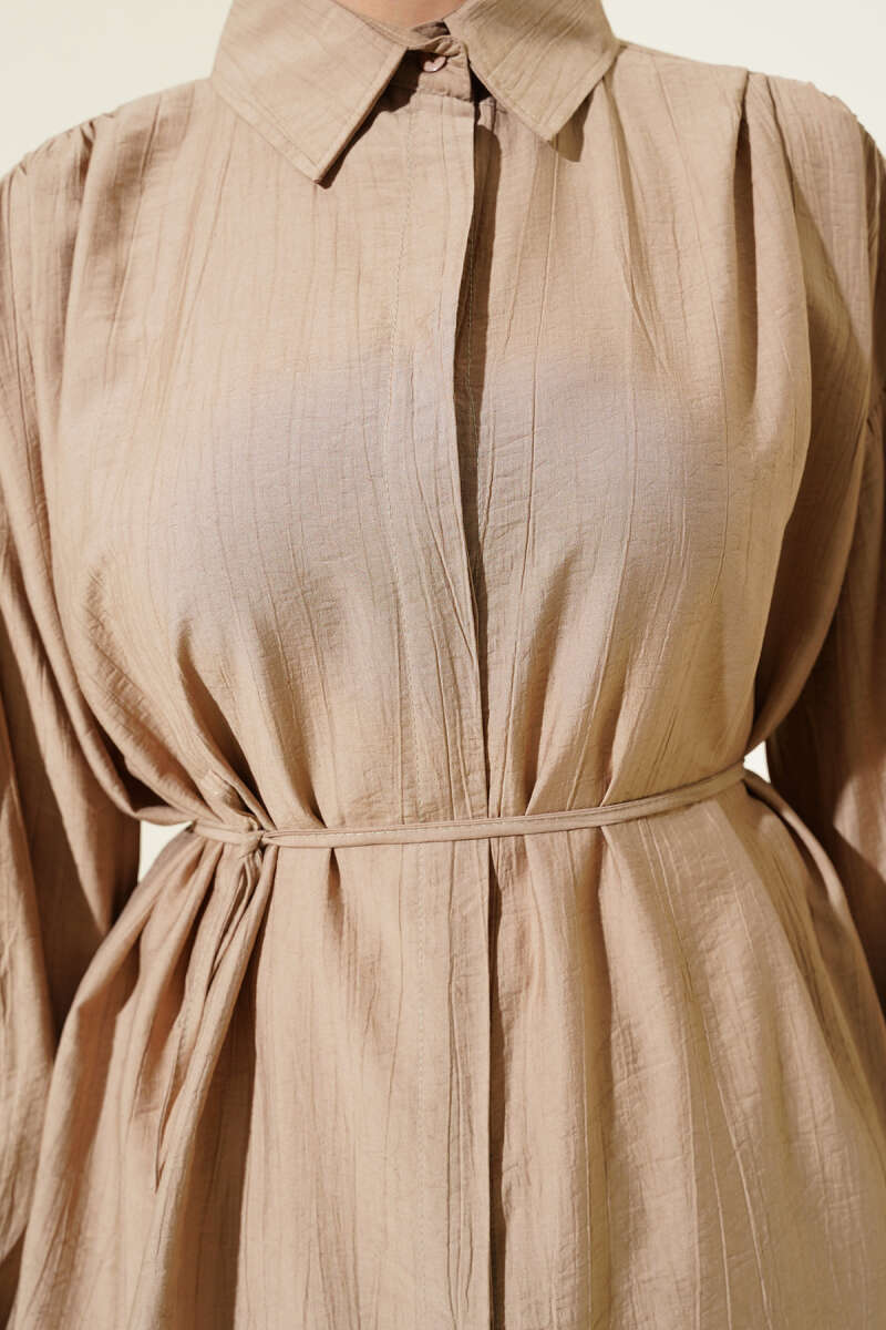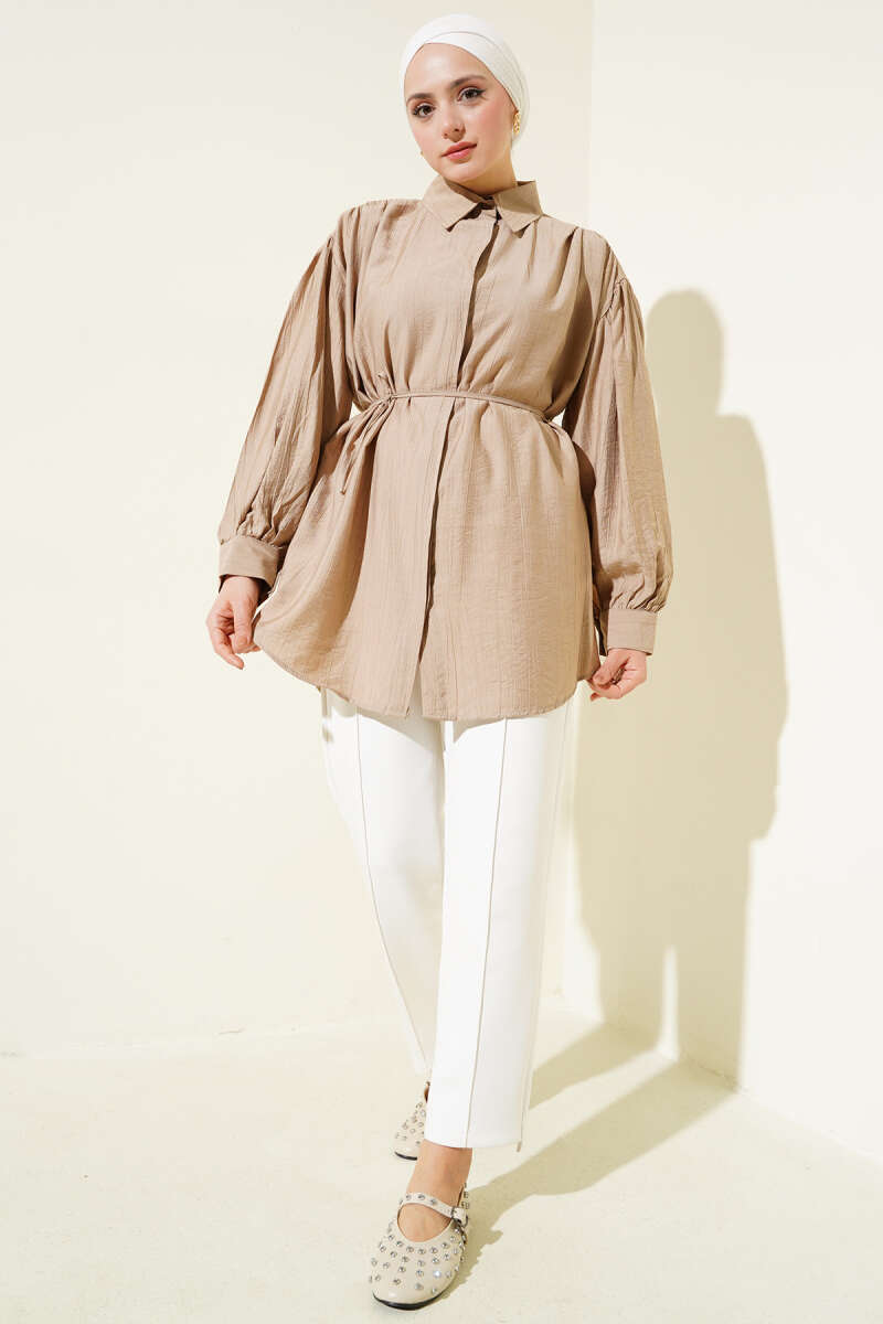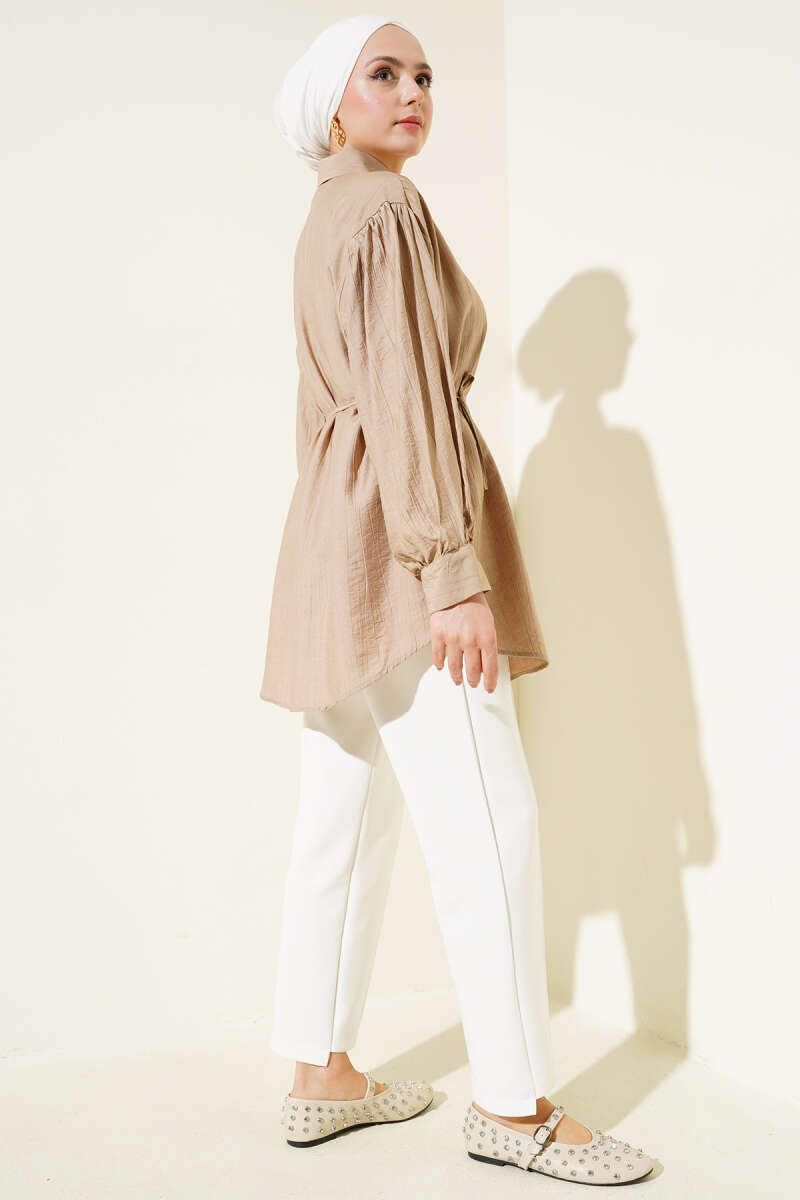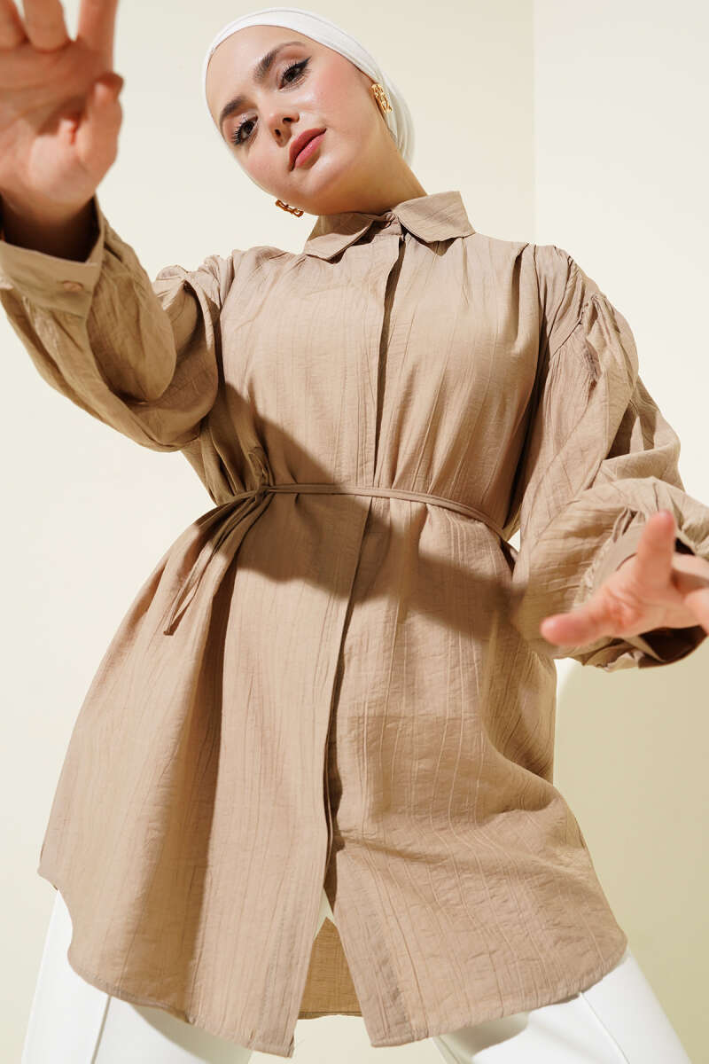 Gizli Düğmeli Balon Kol İp Kuşaklı Gömlek Latte