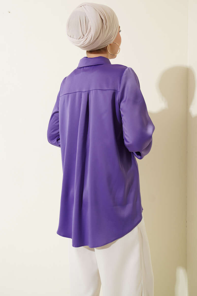 Gizli Düğmeli Basic Saten Gömlek Lila