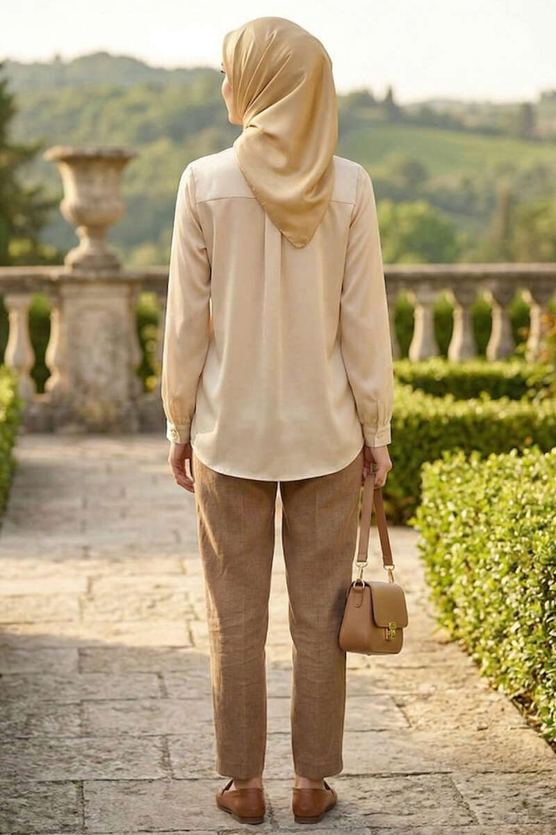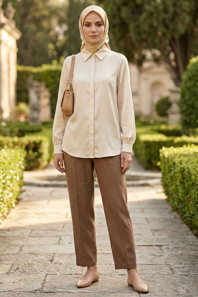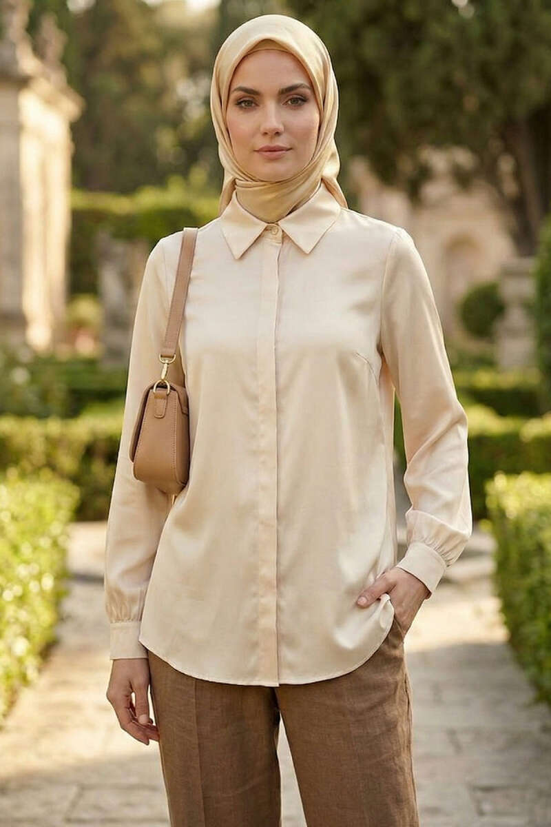 Gizli Düğmeli Basic Saten Gömlek Taş