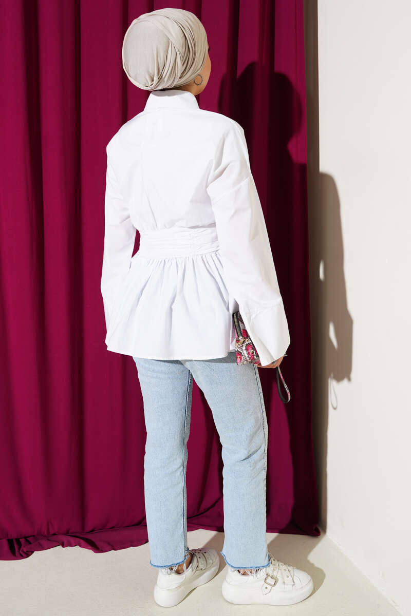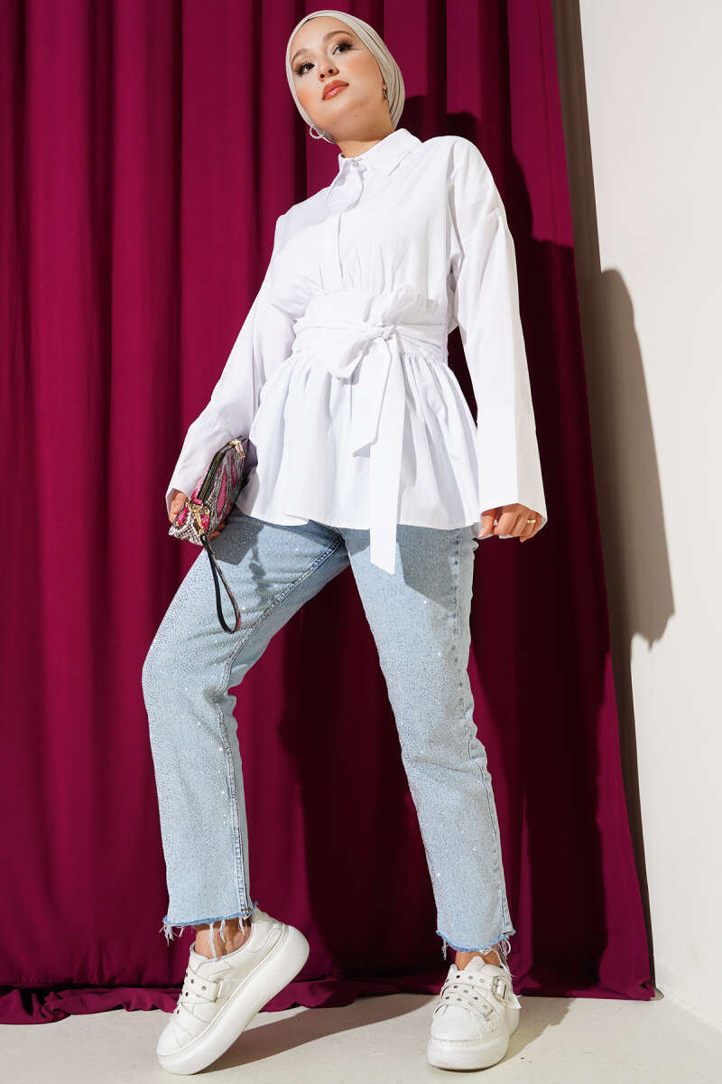 Gizli Düğmeli Bel Kuşaklı Gömlek Beyaz
