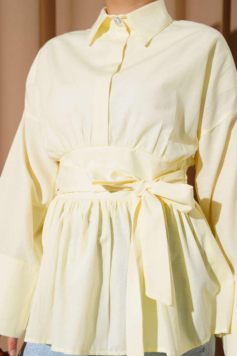 Gizli Düğmeli Bel Kuşaklı Gömlek Sarı
