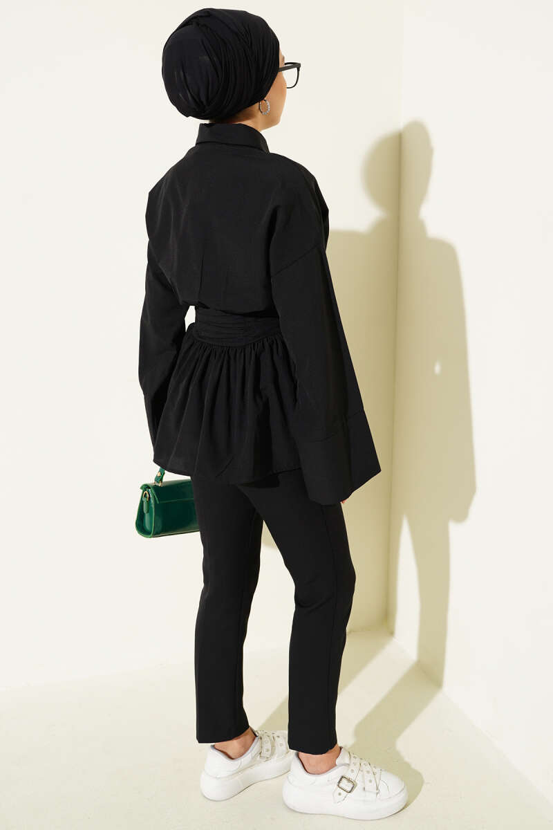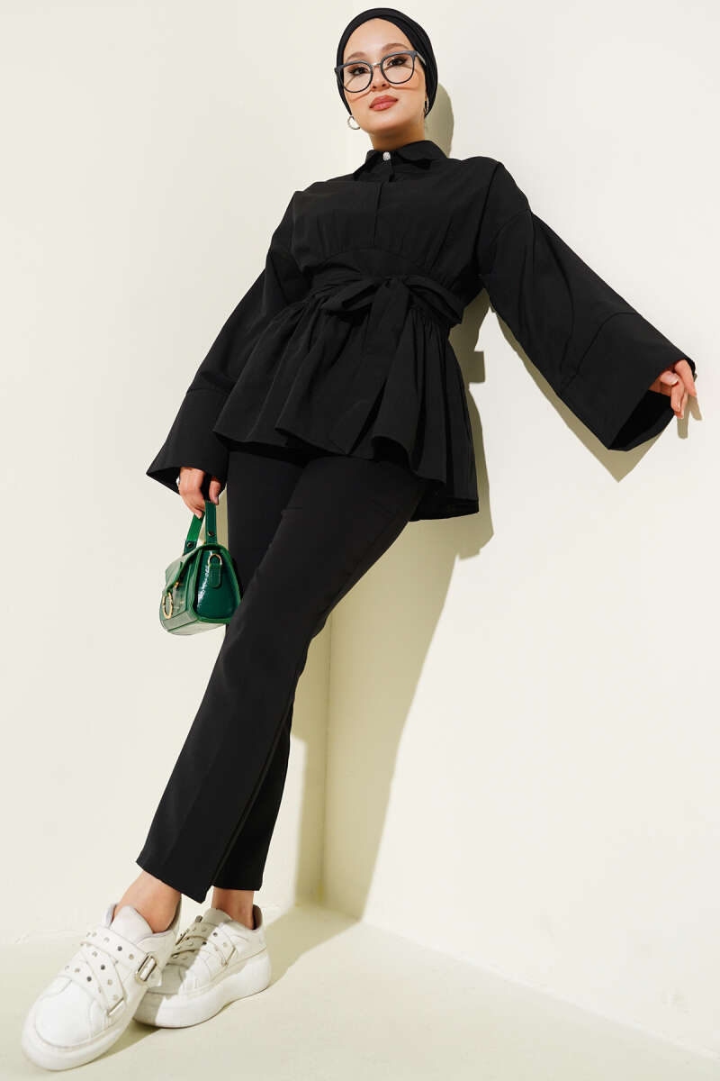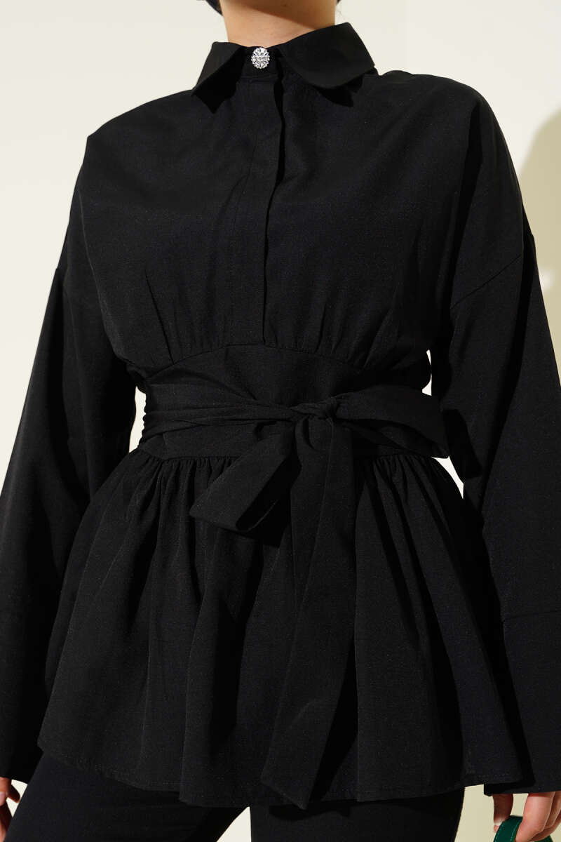 Gizli Düğmeli Bel Kuşaklı Gömlek Siyah