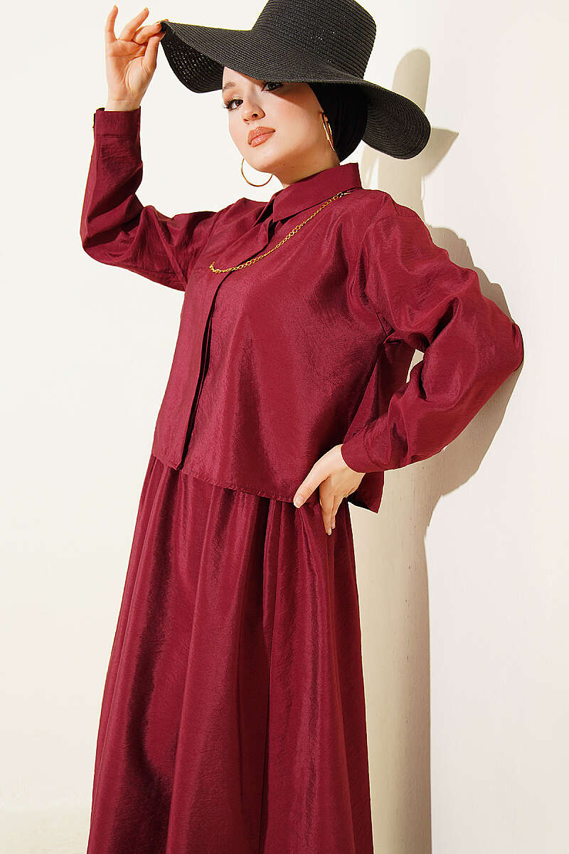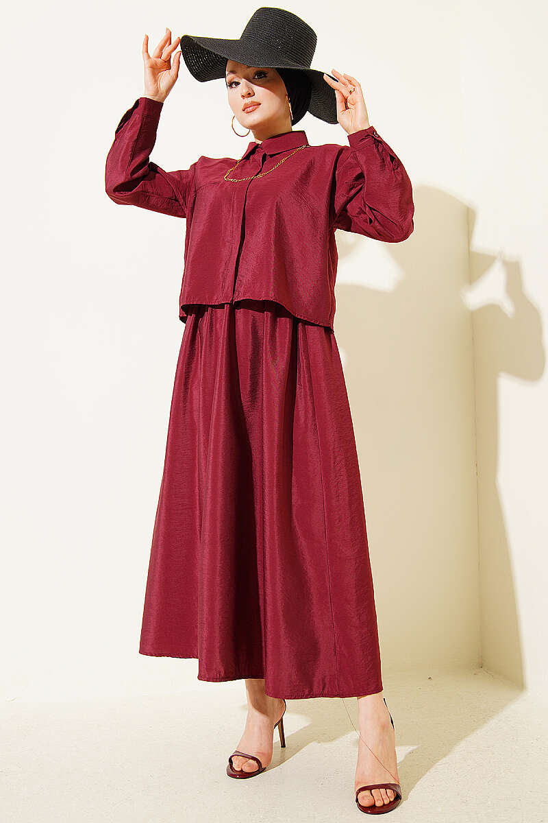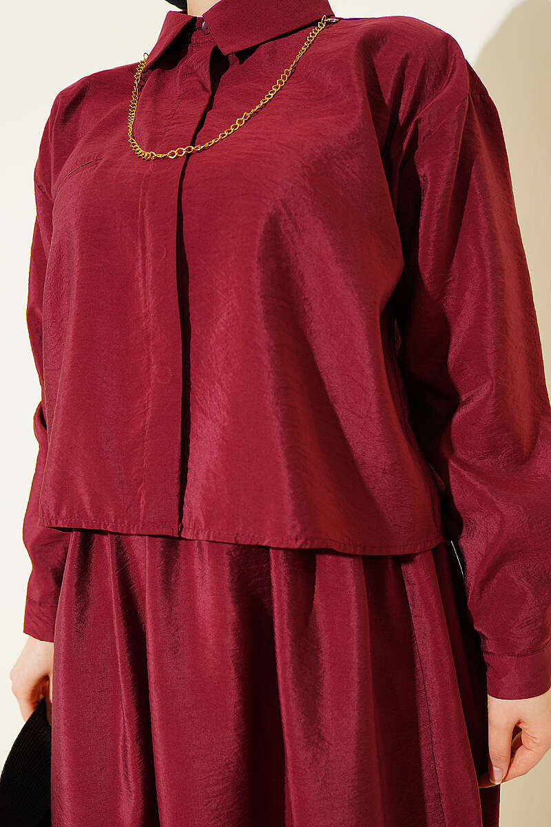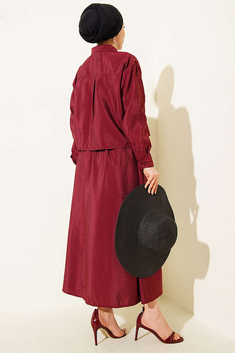 Gizli Düğmeli Bluzlu Etekli İkili Takım Bordo