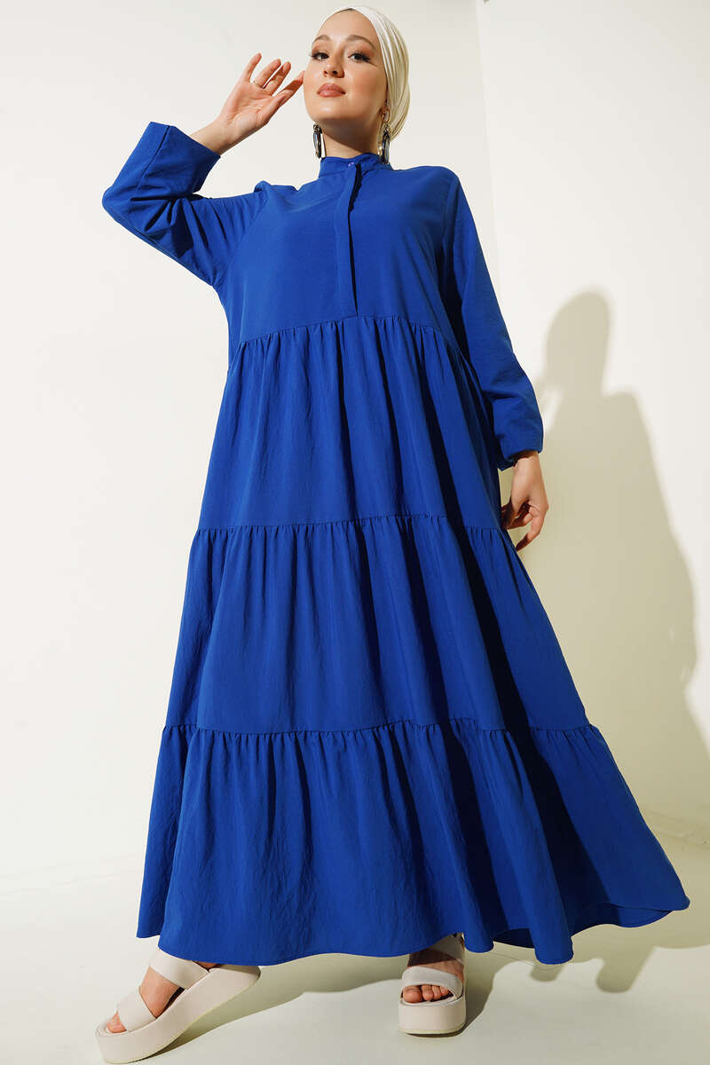 Yeni sezon elbise önü gizli yarım düğmelidir. Bilekleri lastikli olan elbisemiz kat kat modeldir. Tek parçada rahat ve şık olmak isteyen herkesin ilk tercihi olan elbisemiz renk seçenekleriyle harikalar sunmaktadır.