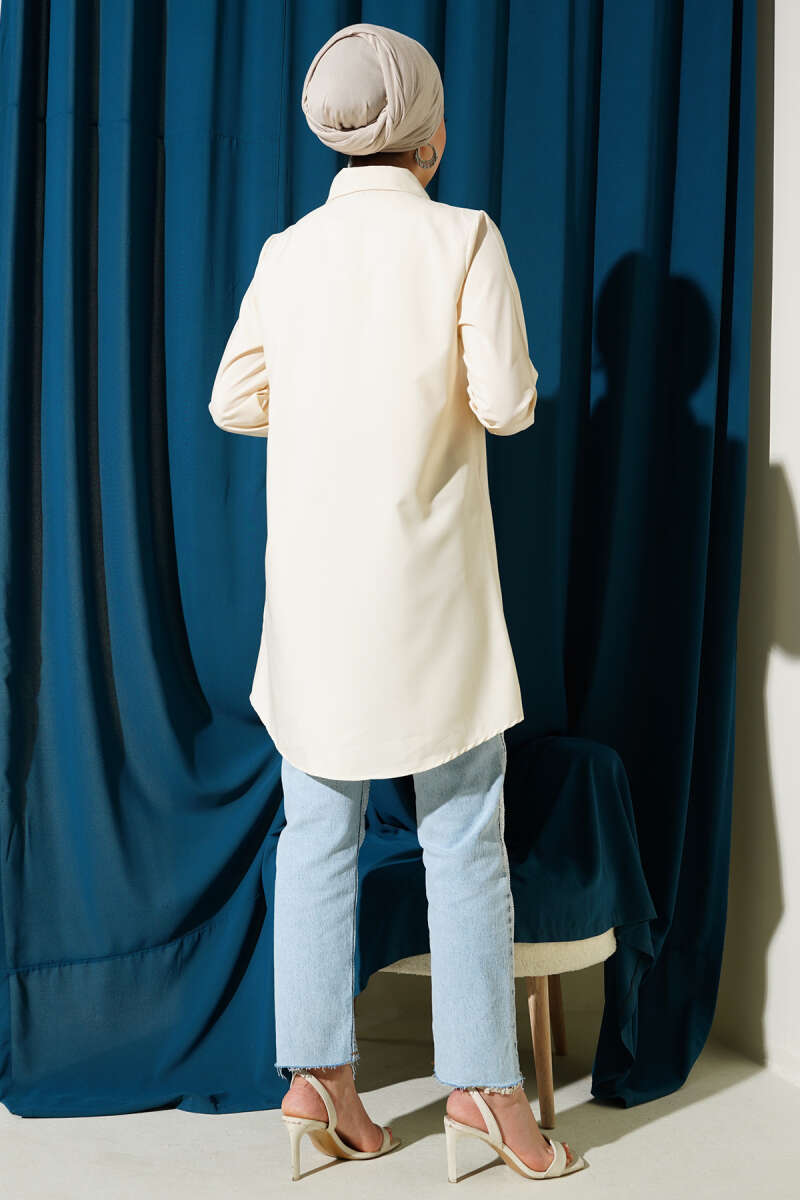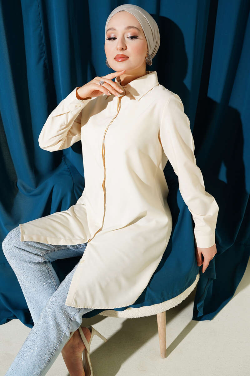 Gizli Düğmeli Klasik Gömlek Krem