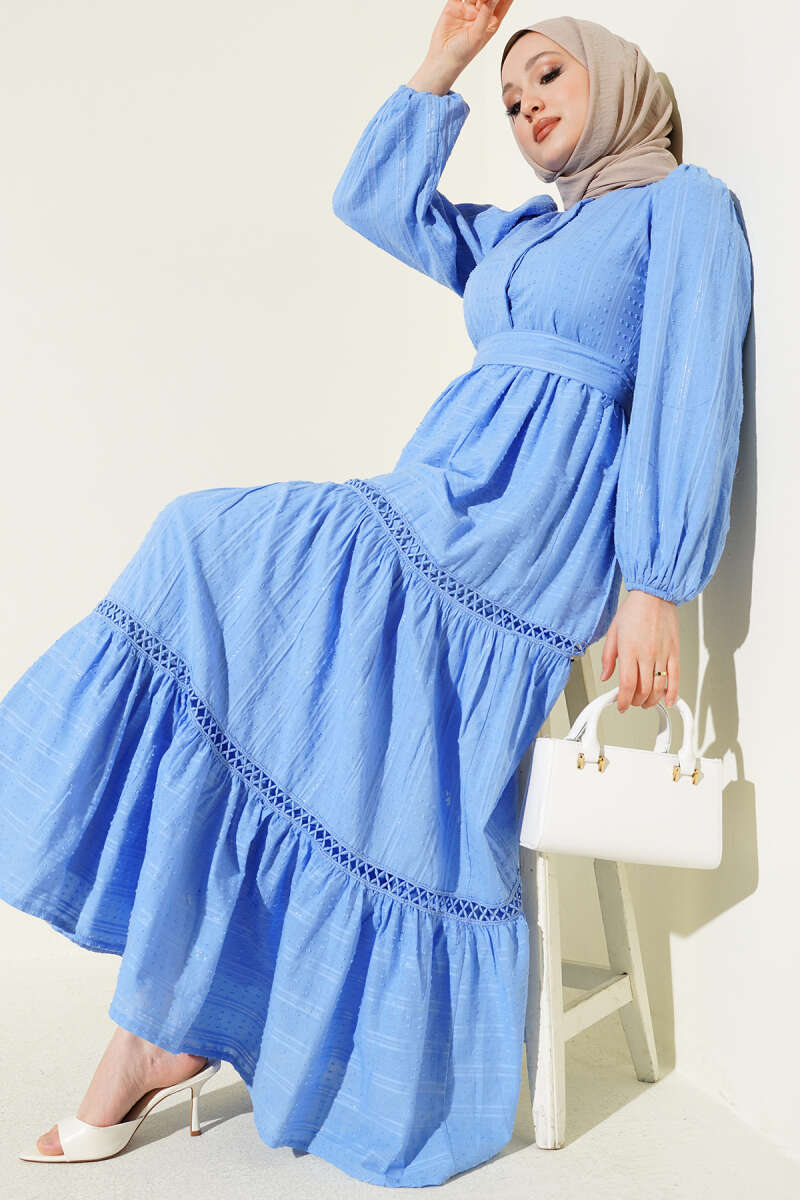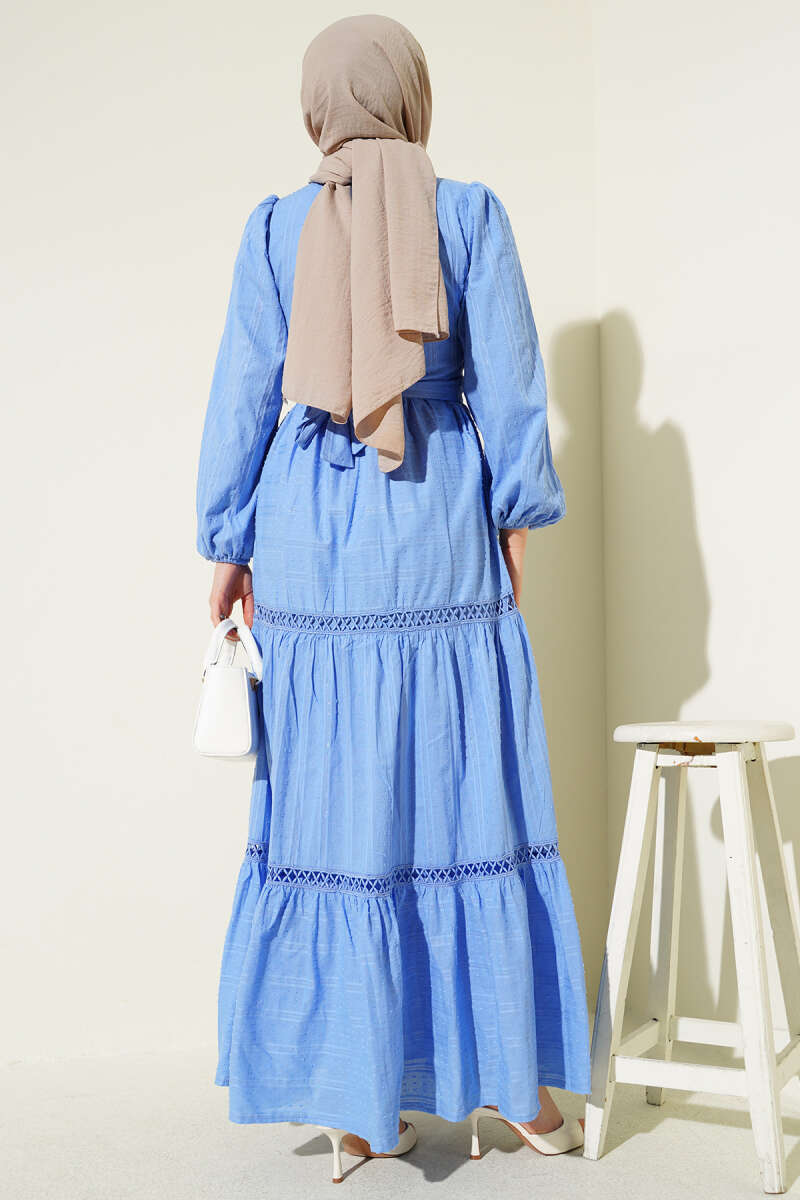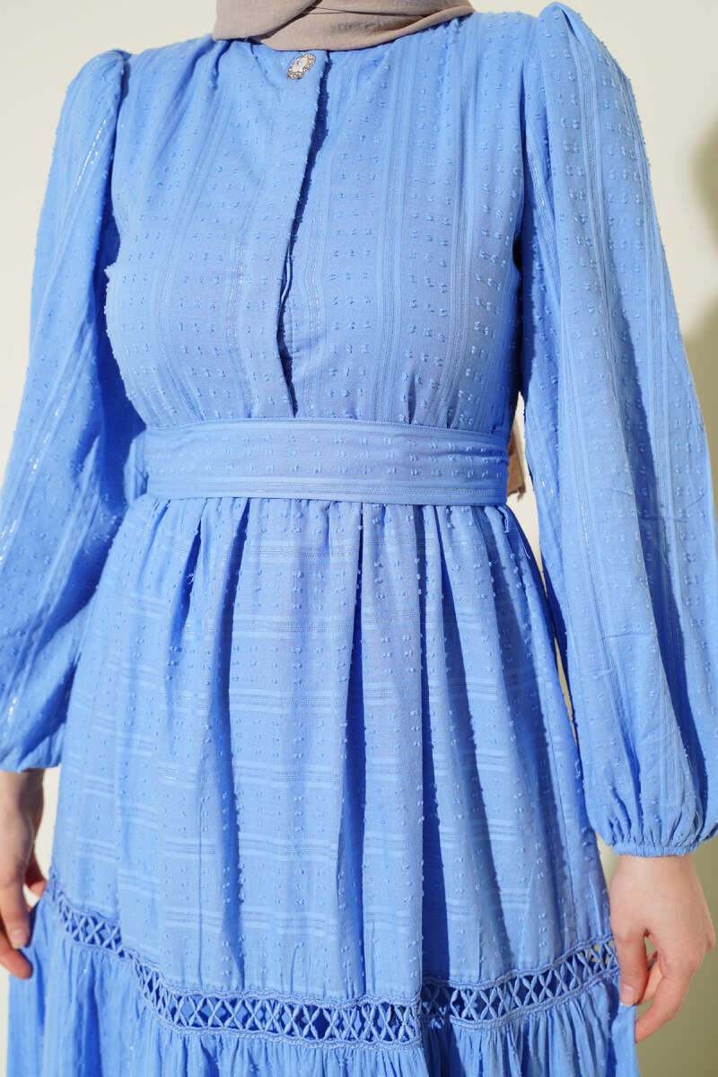 Düğmeli Brode Bilek Lastikli Elbise Mavi