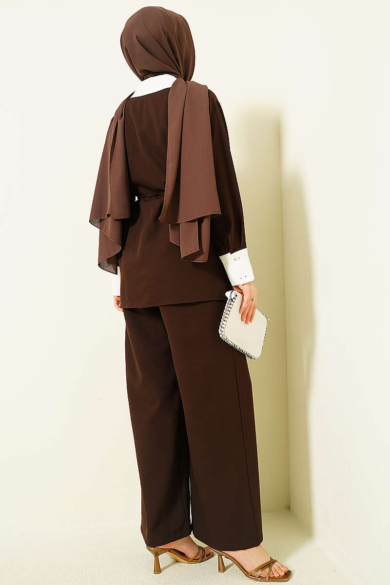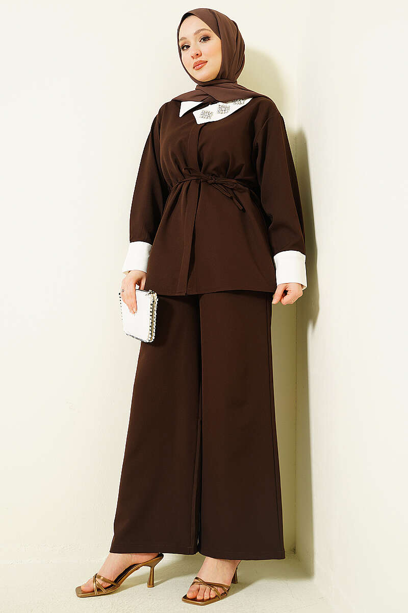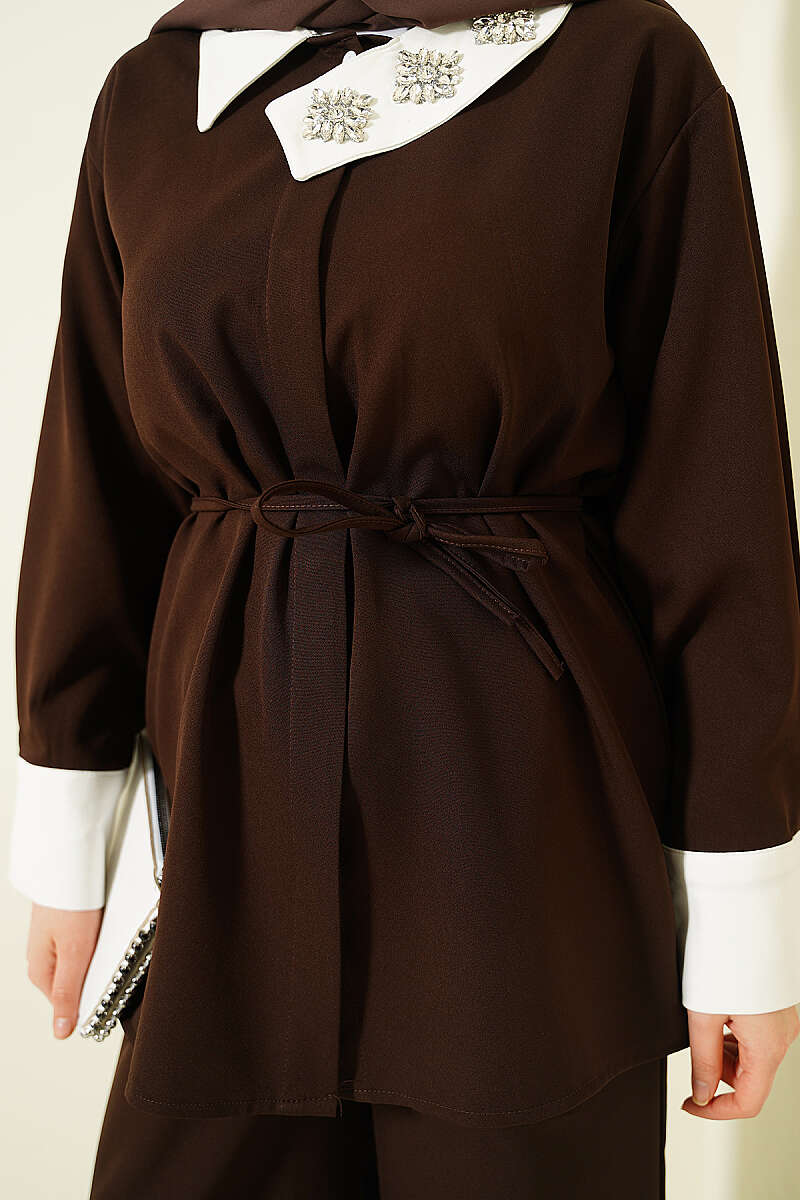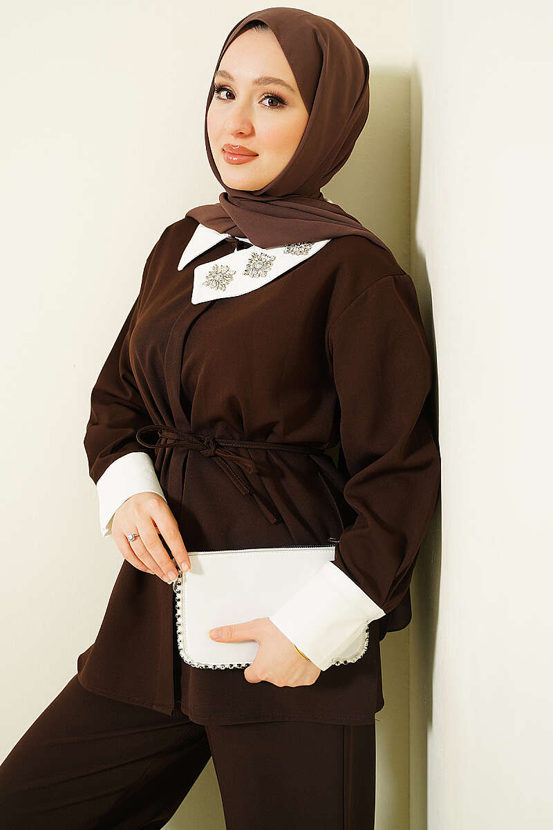 Gizli Düğmeli Yakası Taşlı İkili Takım Kahve