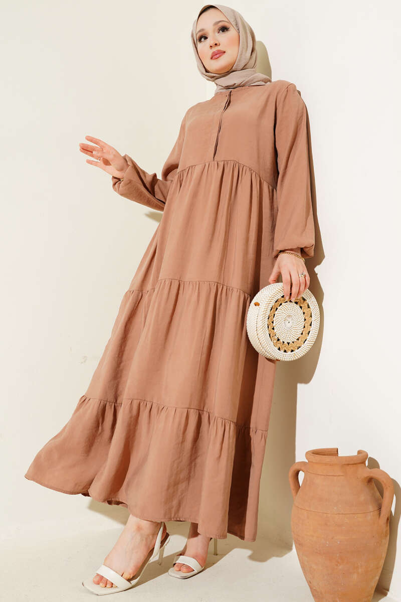 Pelerin Detaylı Pileli Triko Elbise Kahve