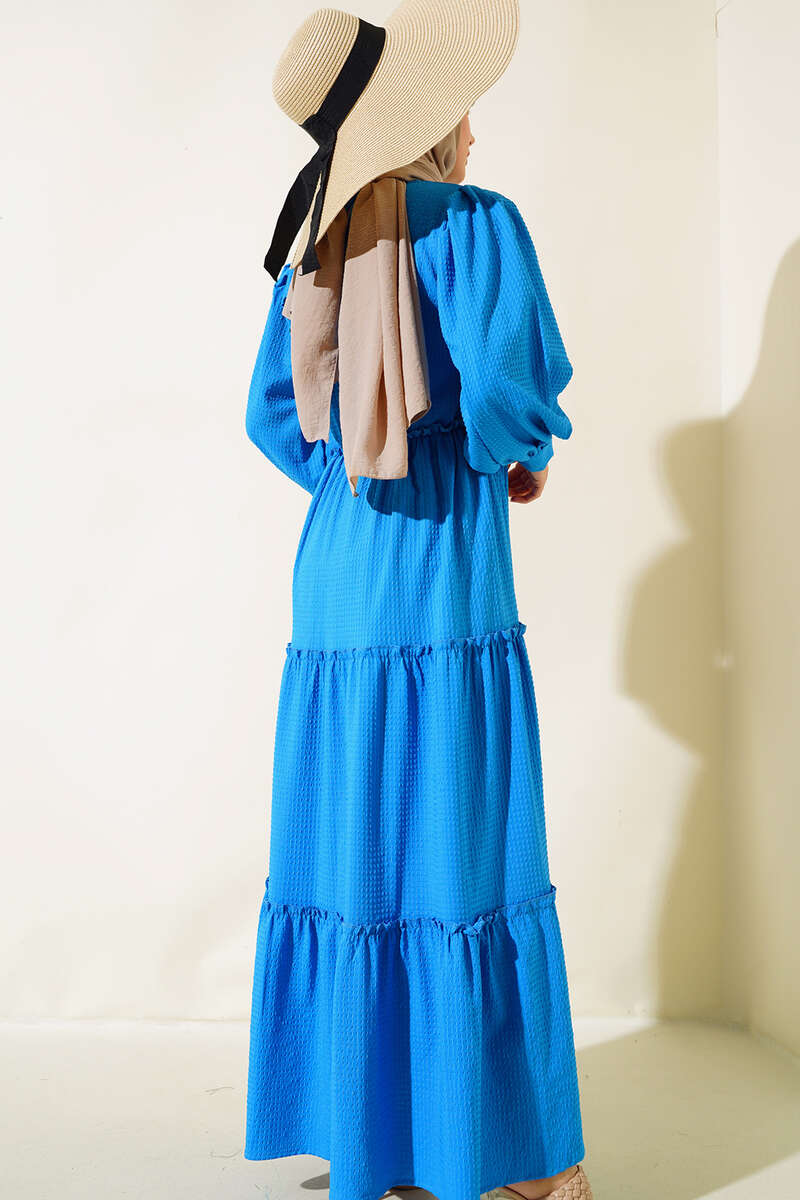 Yeni sezon elbisemiz şık tasarımıyla sizlerle beraber. Elbisemiz gofre kumaştır. Kol bilekleri manşetli ve düğmelidir. Enseden düğmelidir. Astarsızdır. Elbisemiz kat kat modeldir. Renk seçenekleri olan elbise modelimiz yaz ve bahar aylarında hem şık hem rahat olacaksınız.