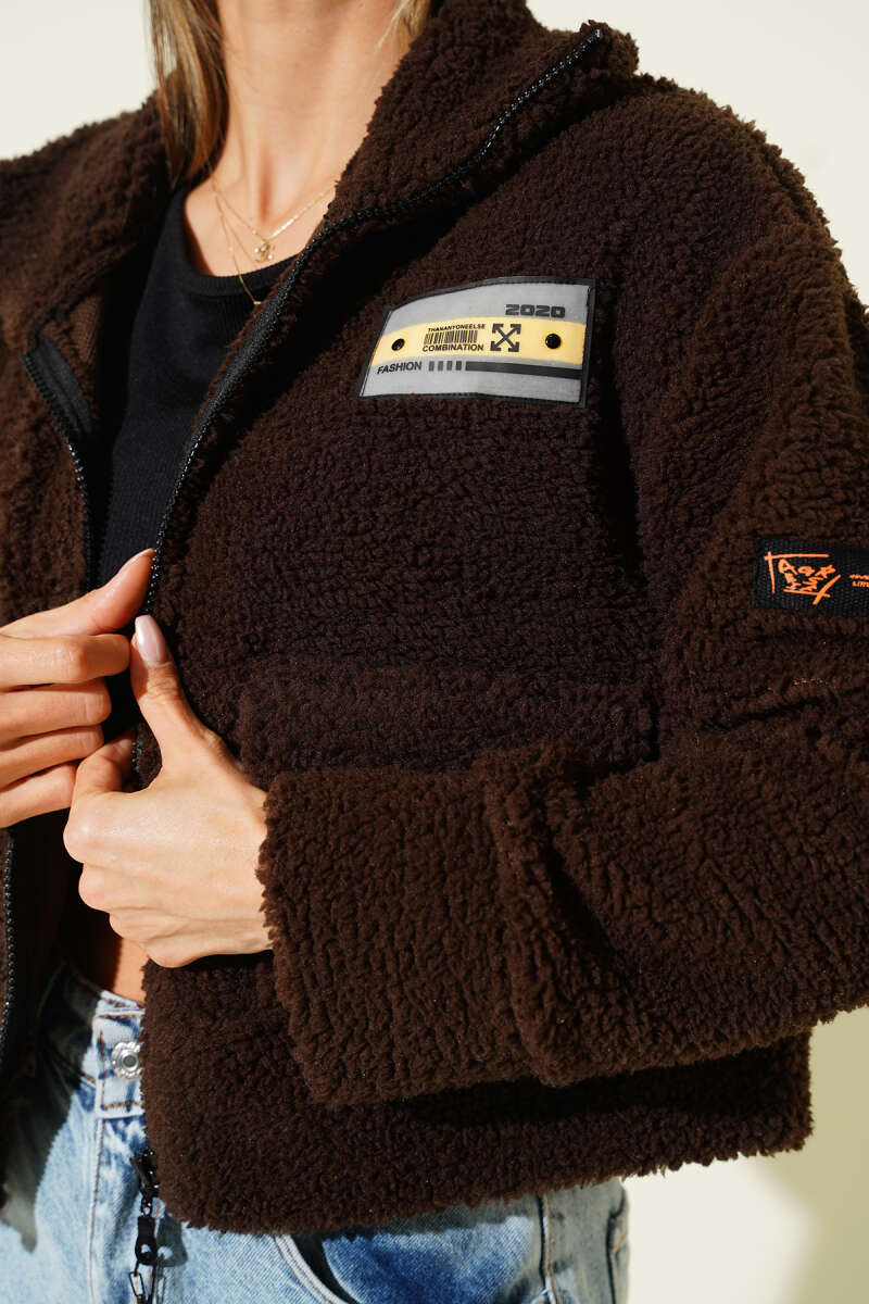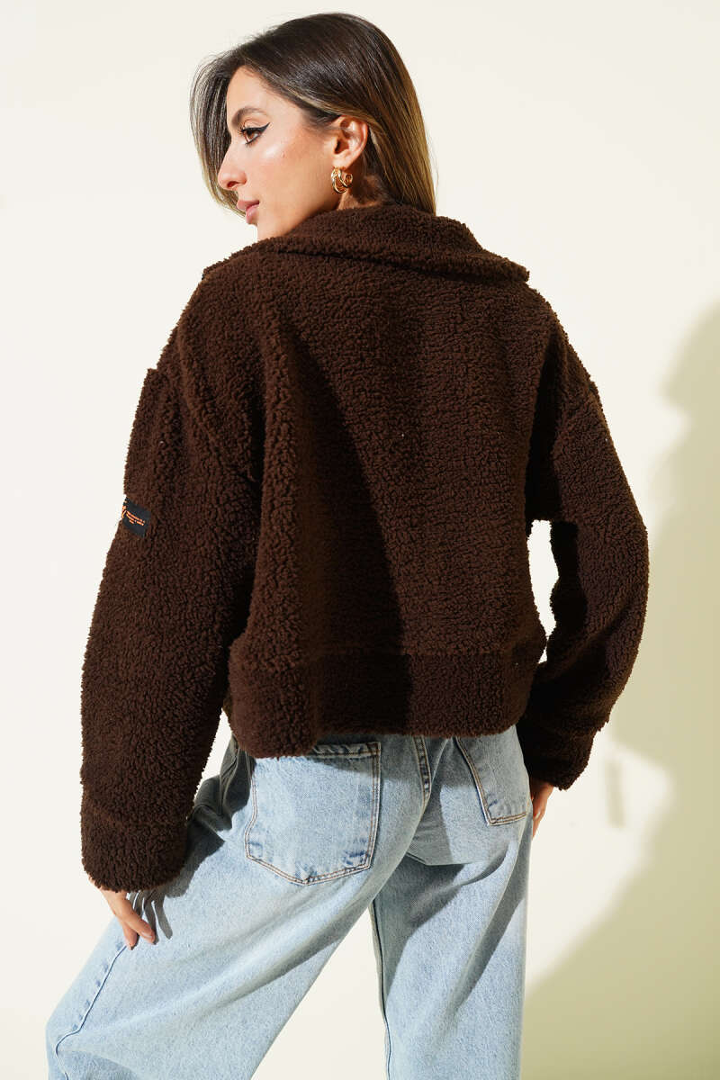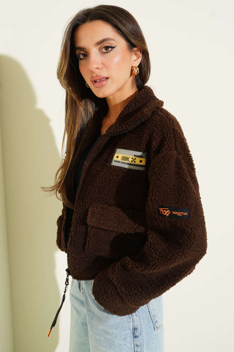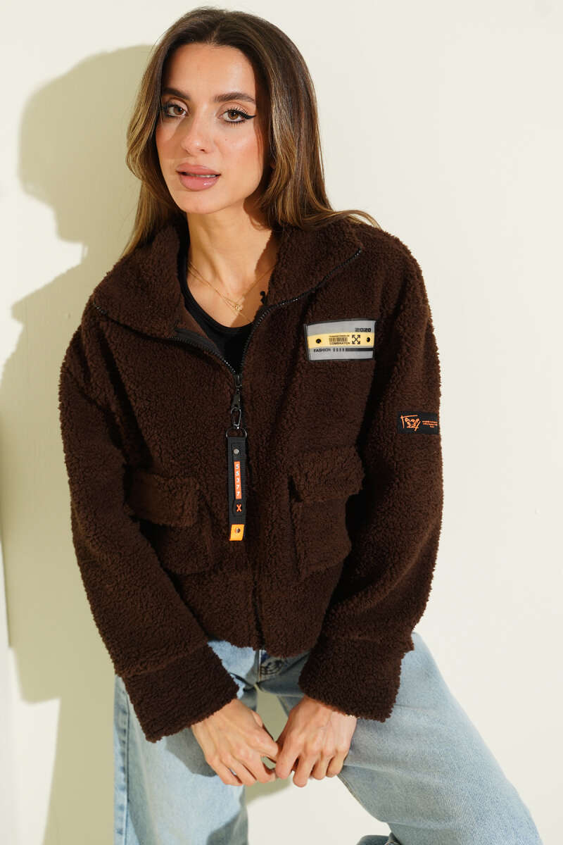 Göğüs Armalı Kısa Peluş Ceket Ekru