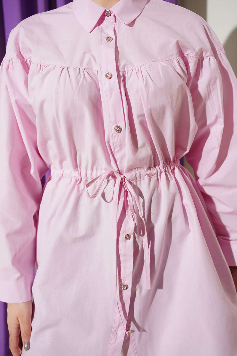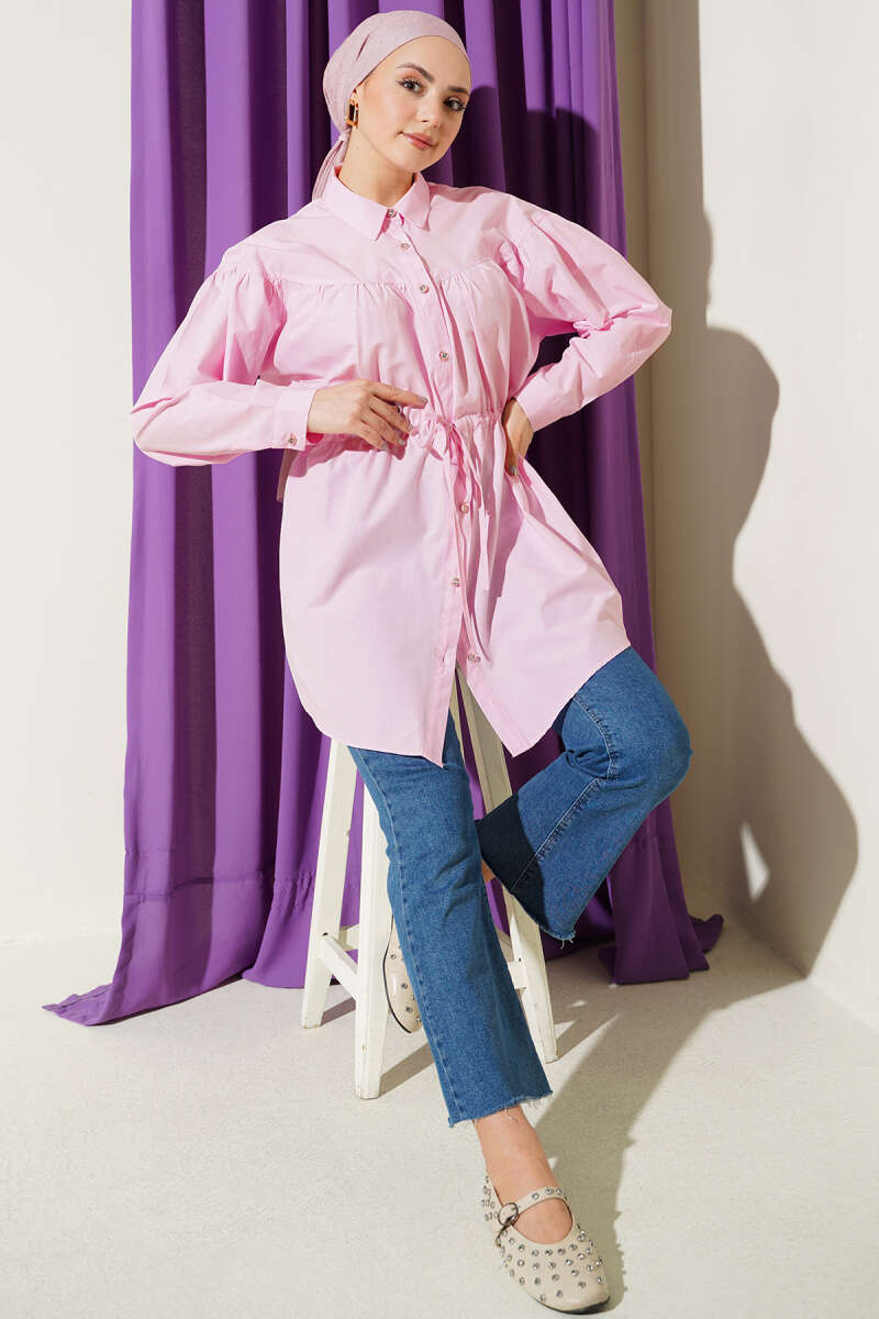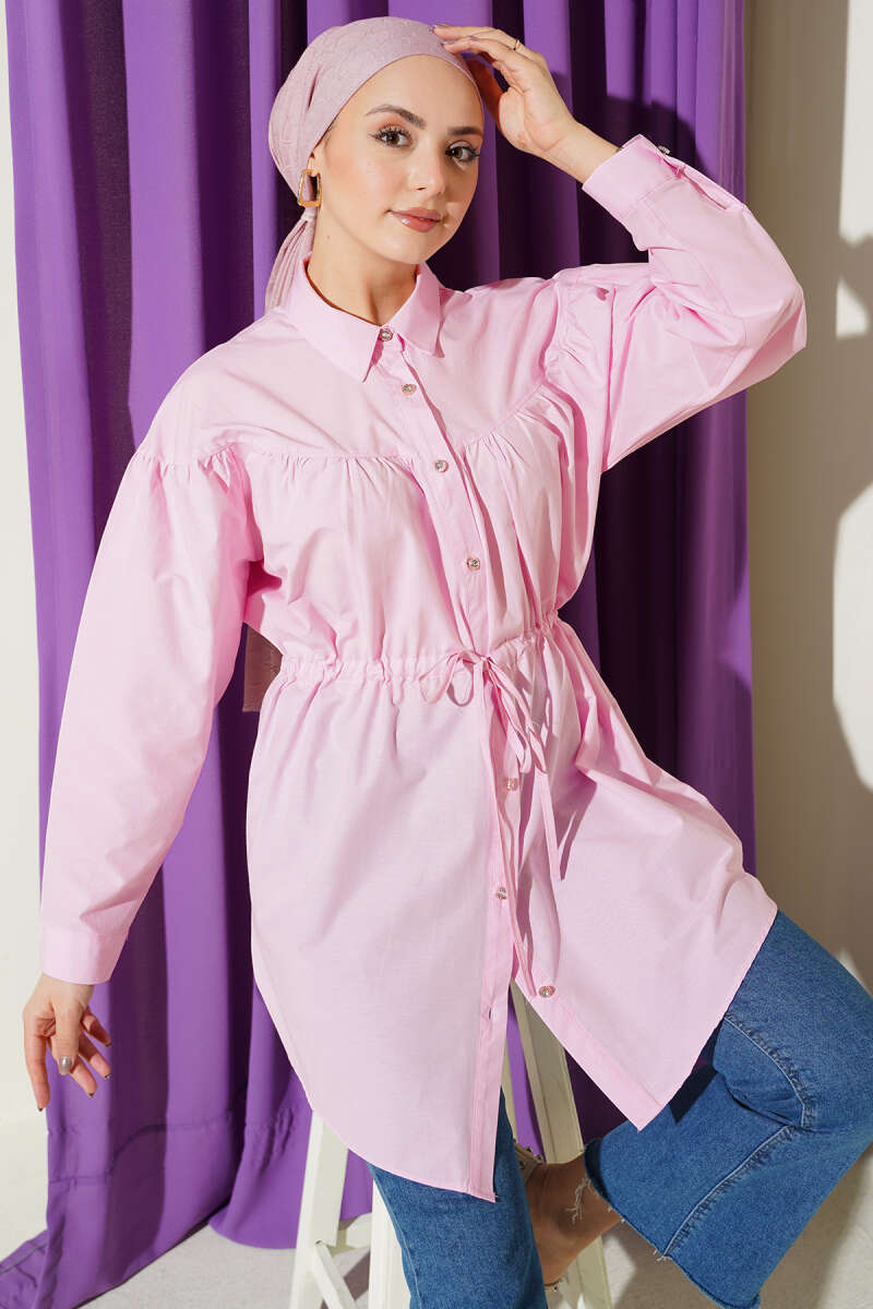 Göğüs Büzgülü Bel Tünelli Gömlek Şeker Pembe