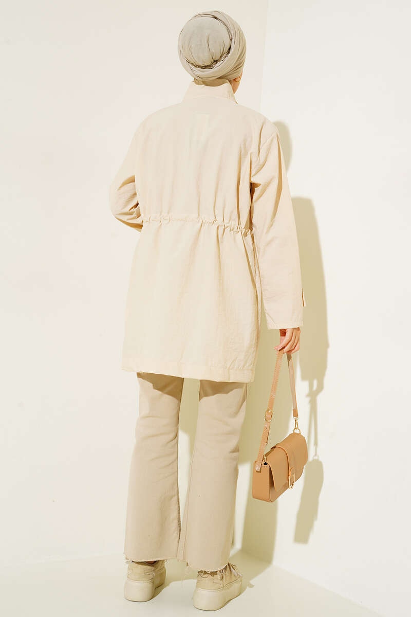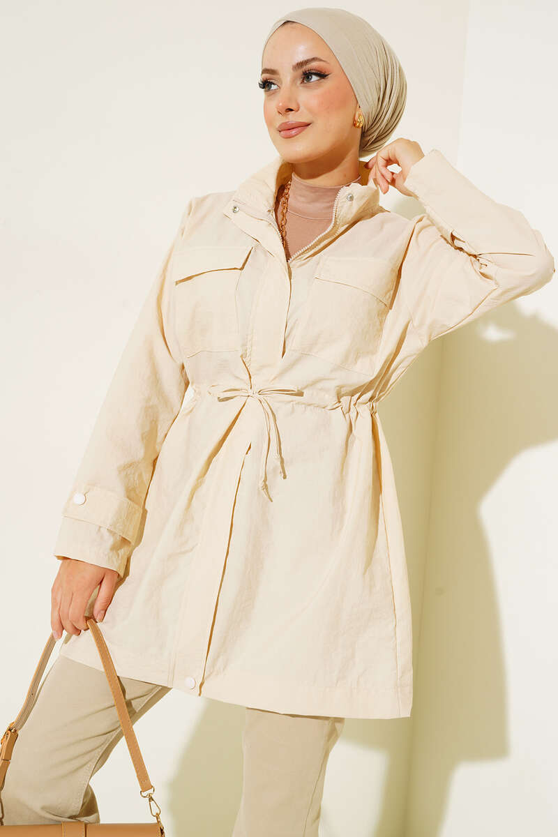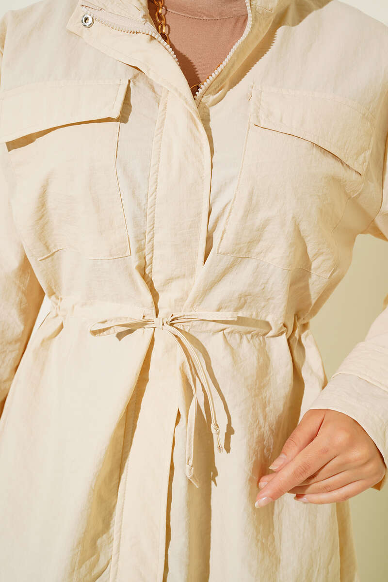 Göğüs Cepli Dik Yaka Yağmurluk Bej