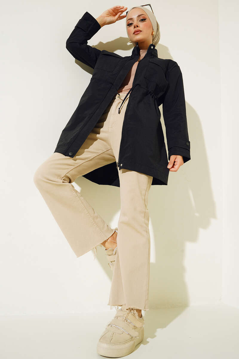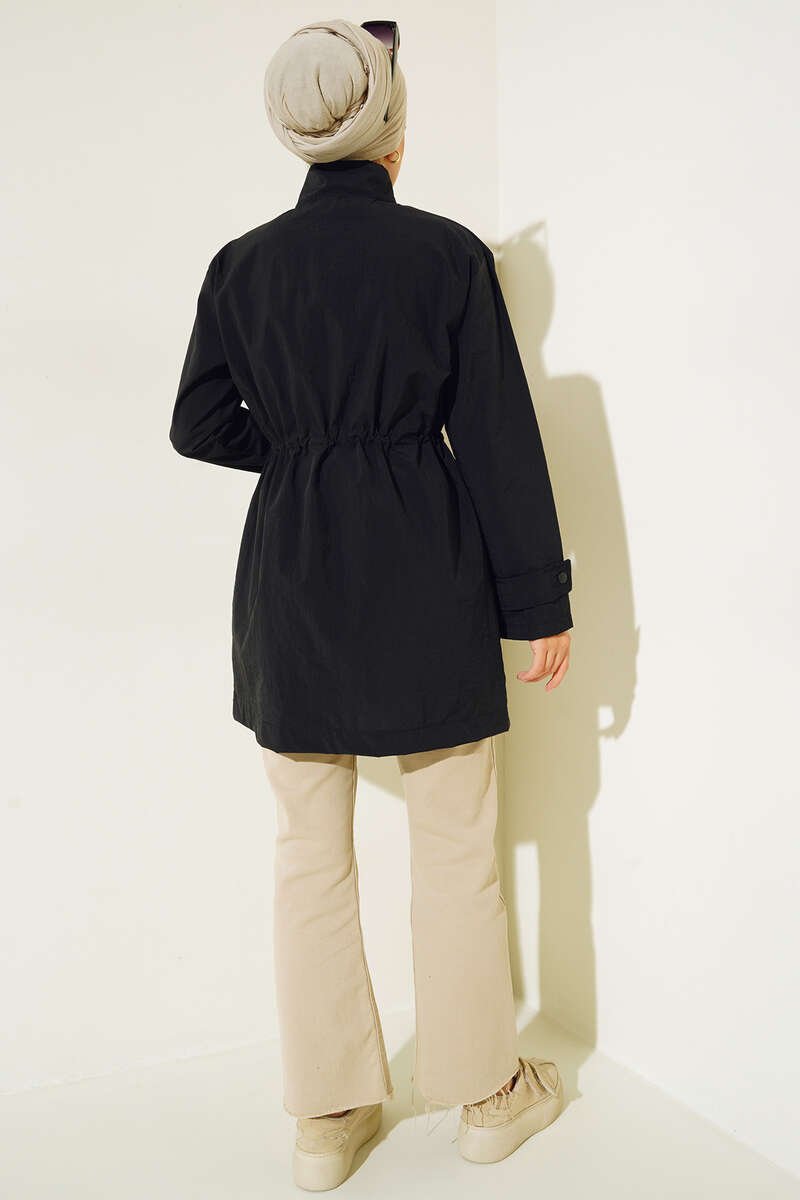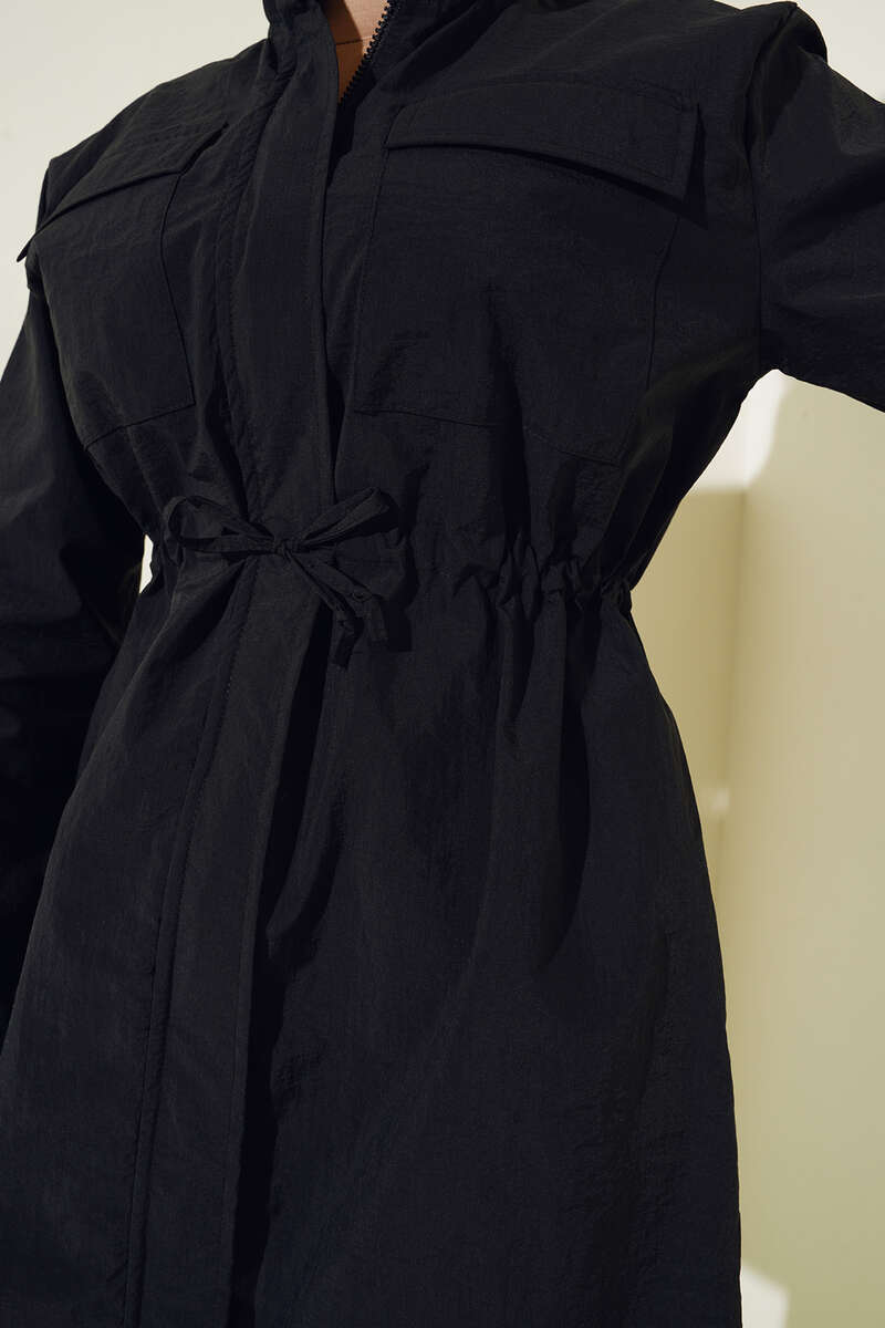 Yeni sezon yağmurluk modelimiz göğsünde bulunan iki adet kapaklı cebiyle detaylanmıştır. Dik yaka yağmurluğumuz boydan fermuarlıdır. Fermuarına çıtçıt düğmeleri eşlik etmektedir. Beli tünelli ip bağlamalıdır.