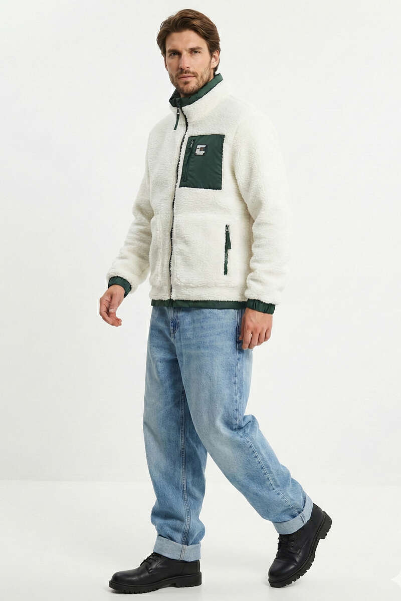 Göğüs Cepli Fermuarlı Peluş Erkek Mont Krem