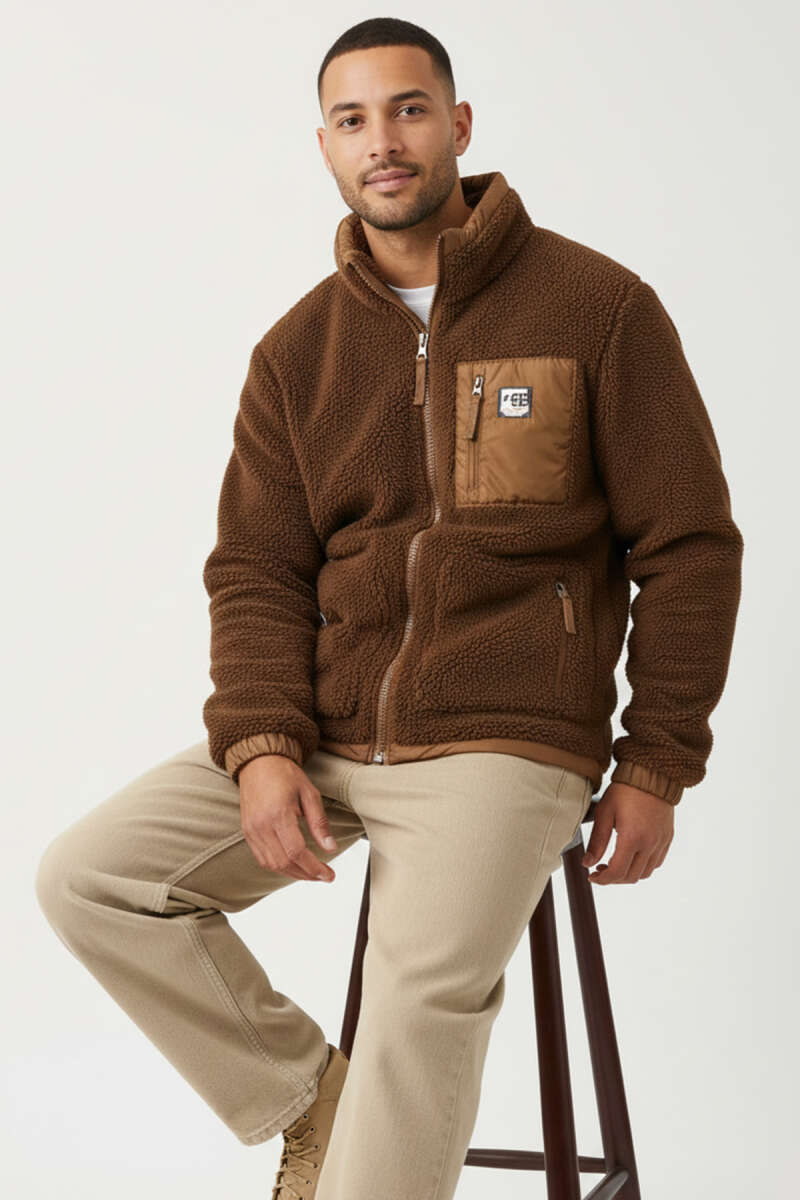 Göğüs Cepli Fermuarlı Peluş Erkek Mont Krem