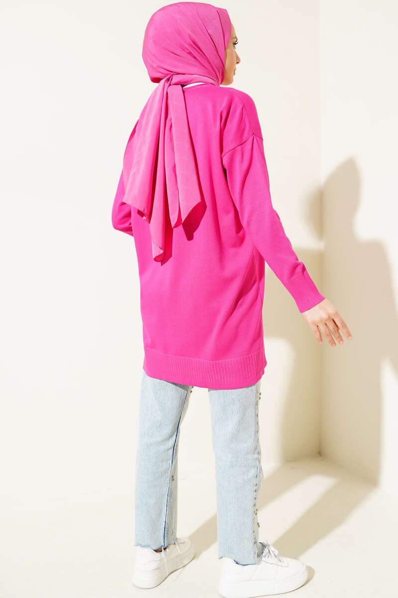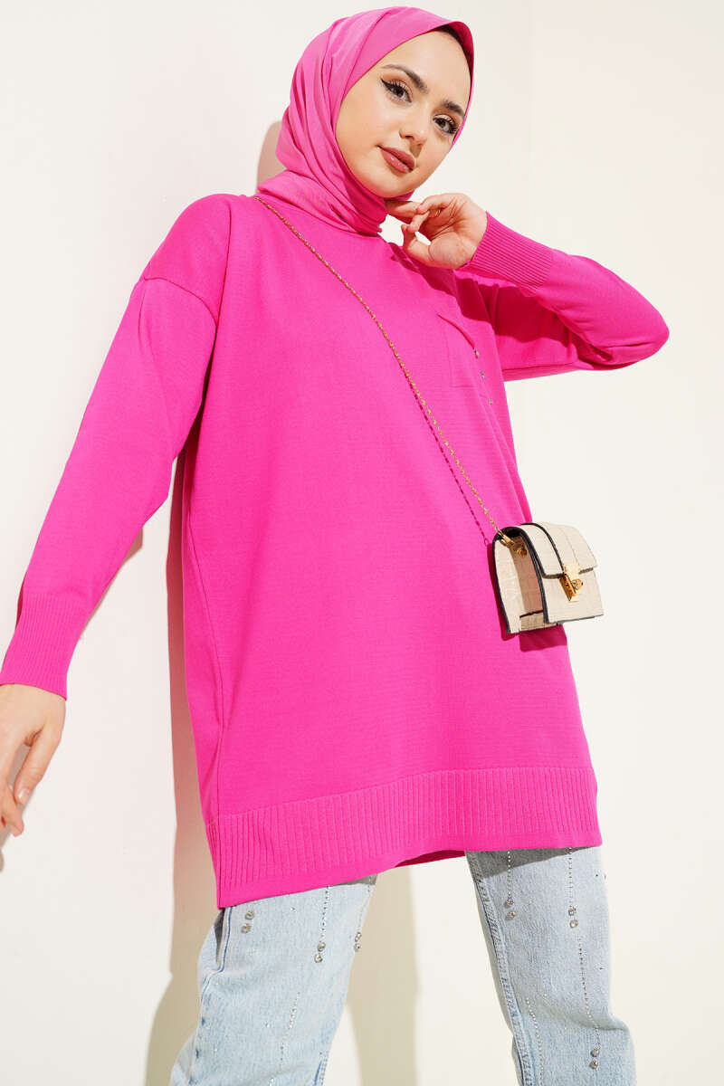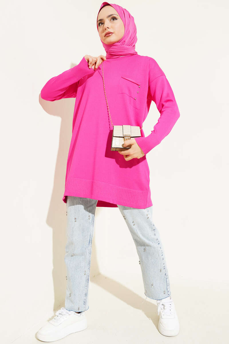 Göğüs Cepli Taşlı Triko Tunik Fuşya