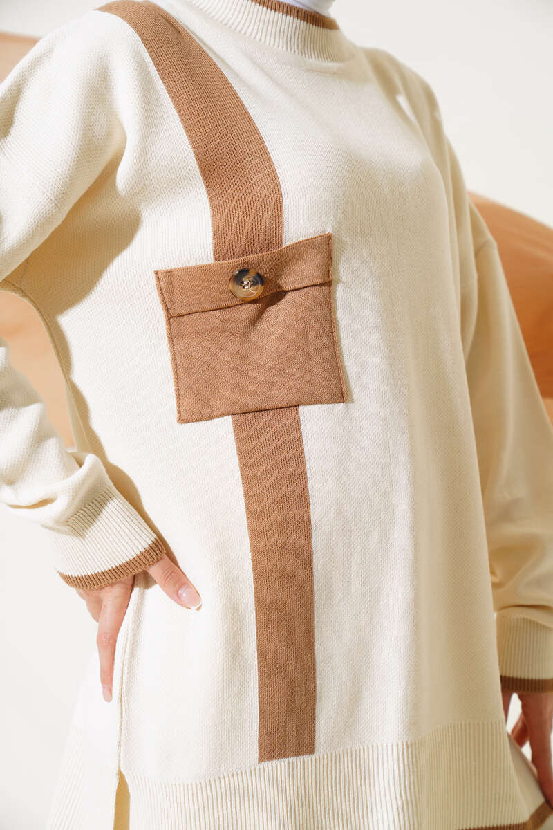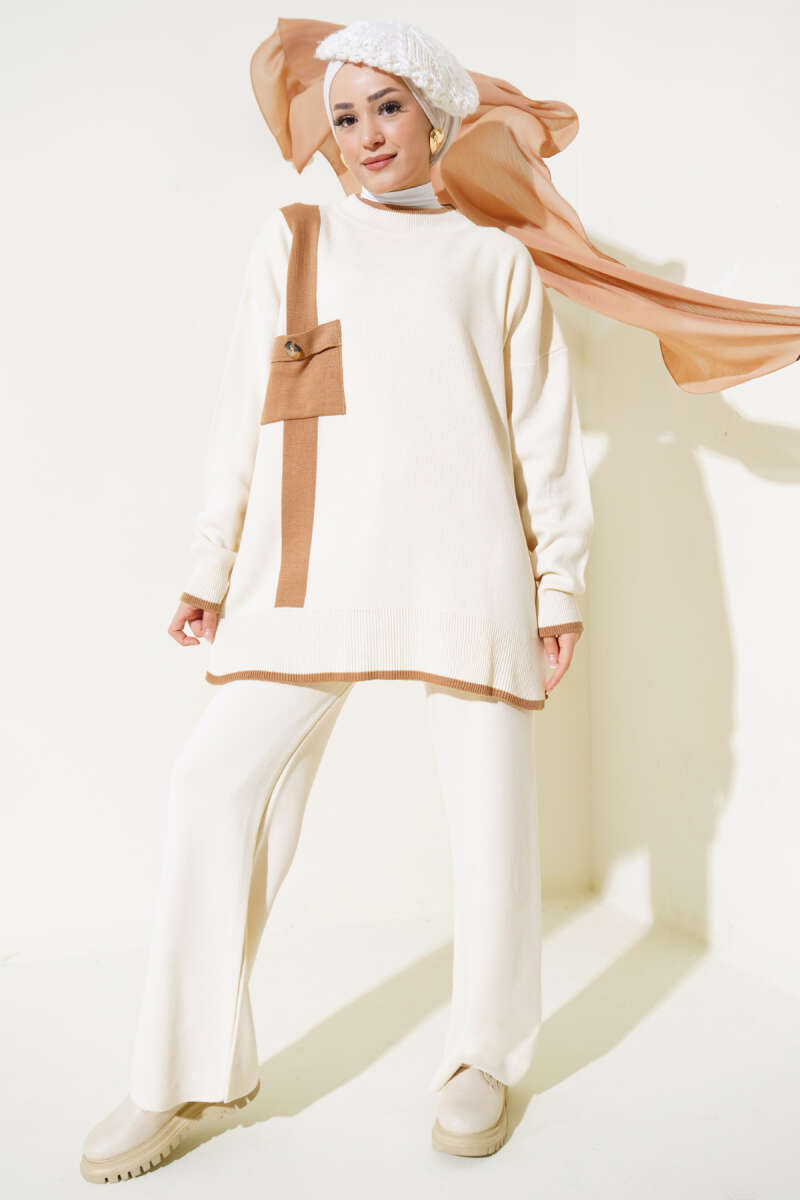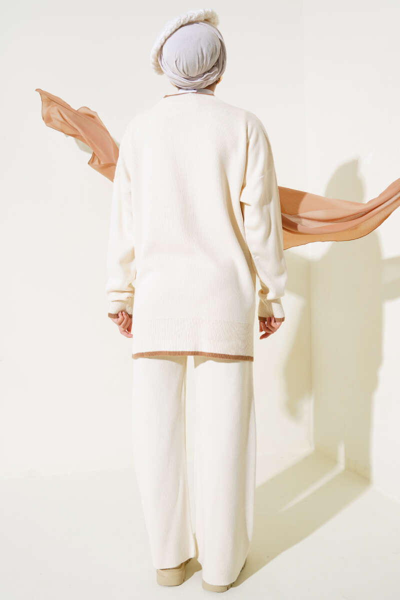 Dikiş Detaylı Basic Triko İkili Takım Bej