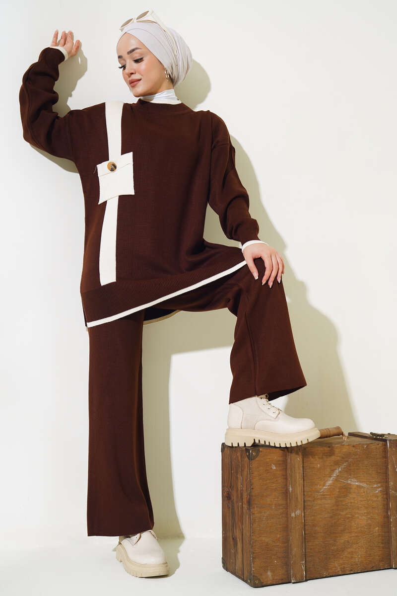 Taşlı Baklava Desen Triko İkili Takım Kahve