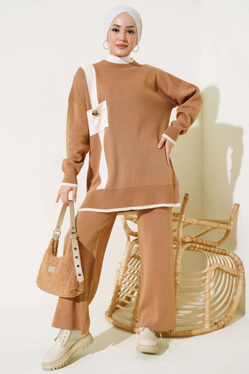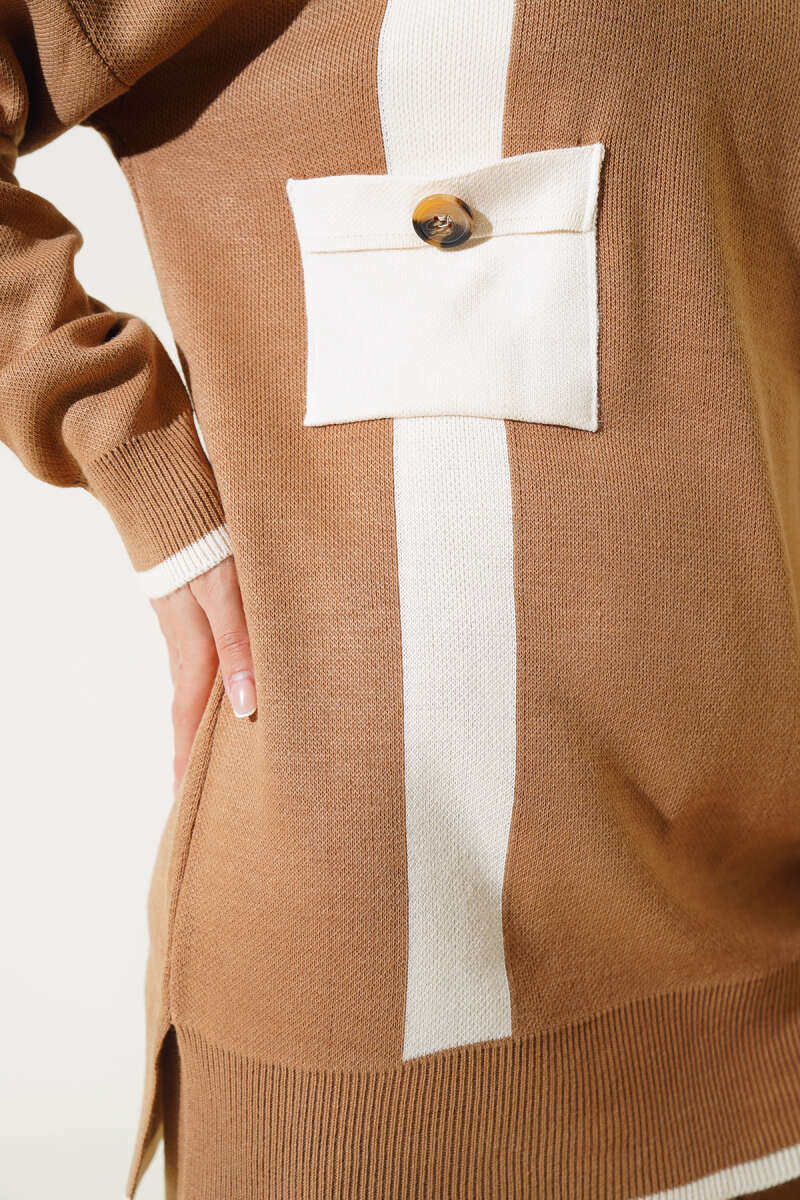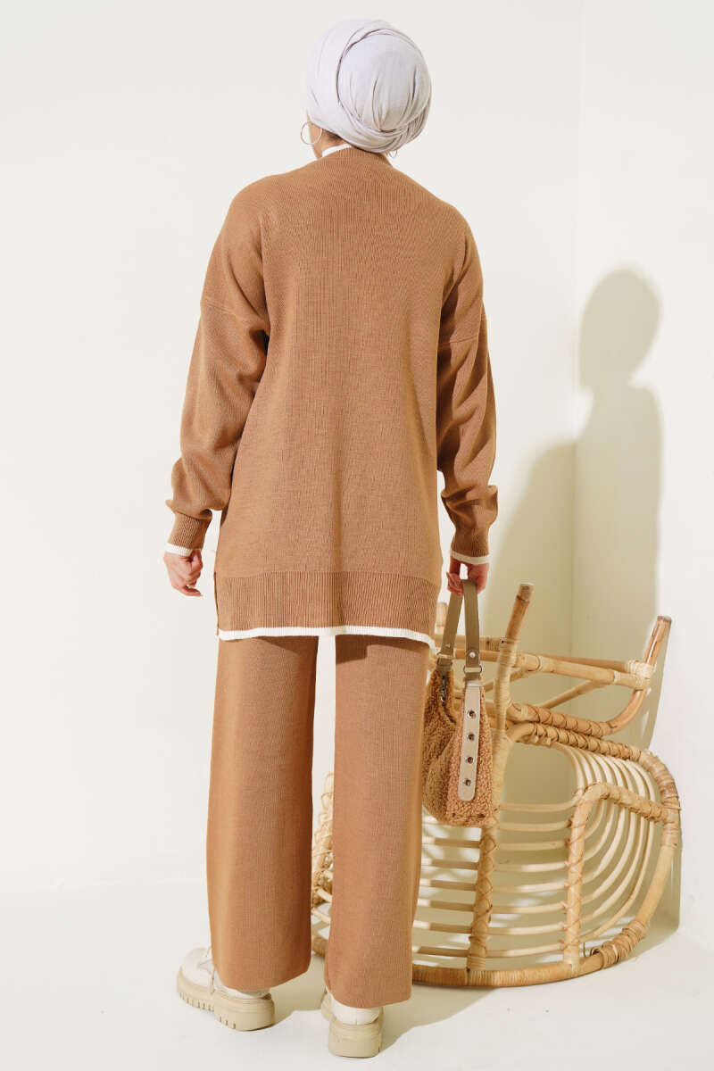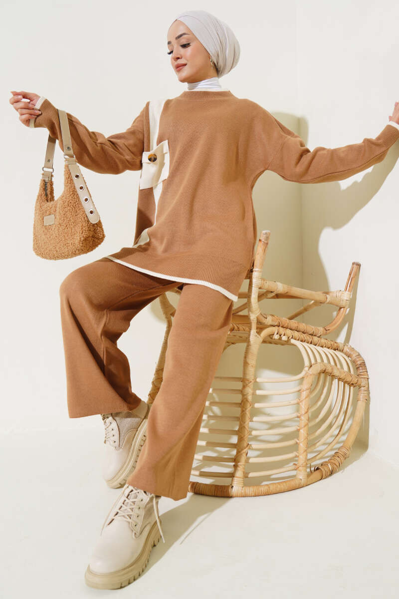 Balon Kol Balıkçı Yaka Triko İkili Takım Kahve