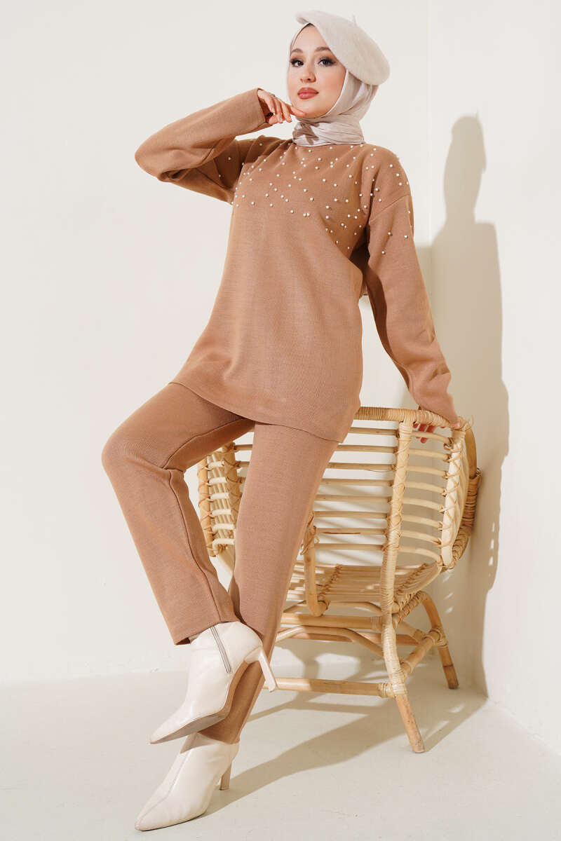 Balıkçı Yaka Fitilli Triko İkili Takım Kahve