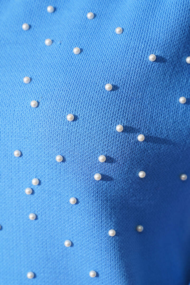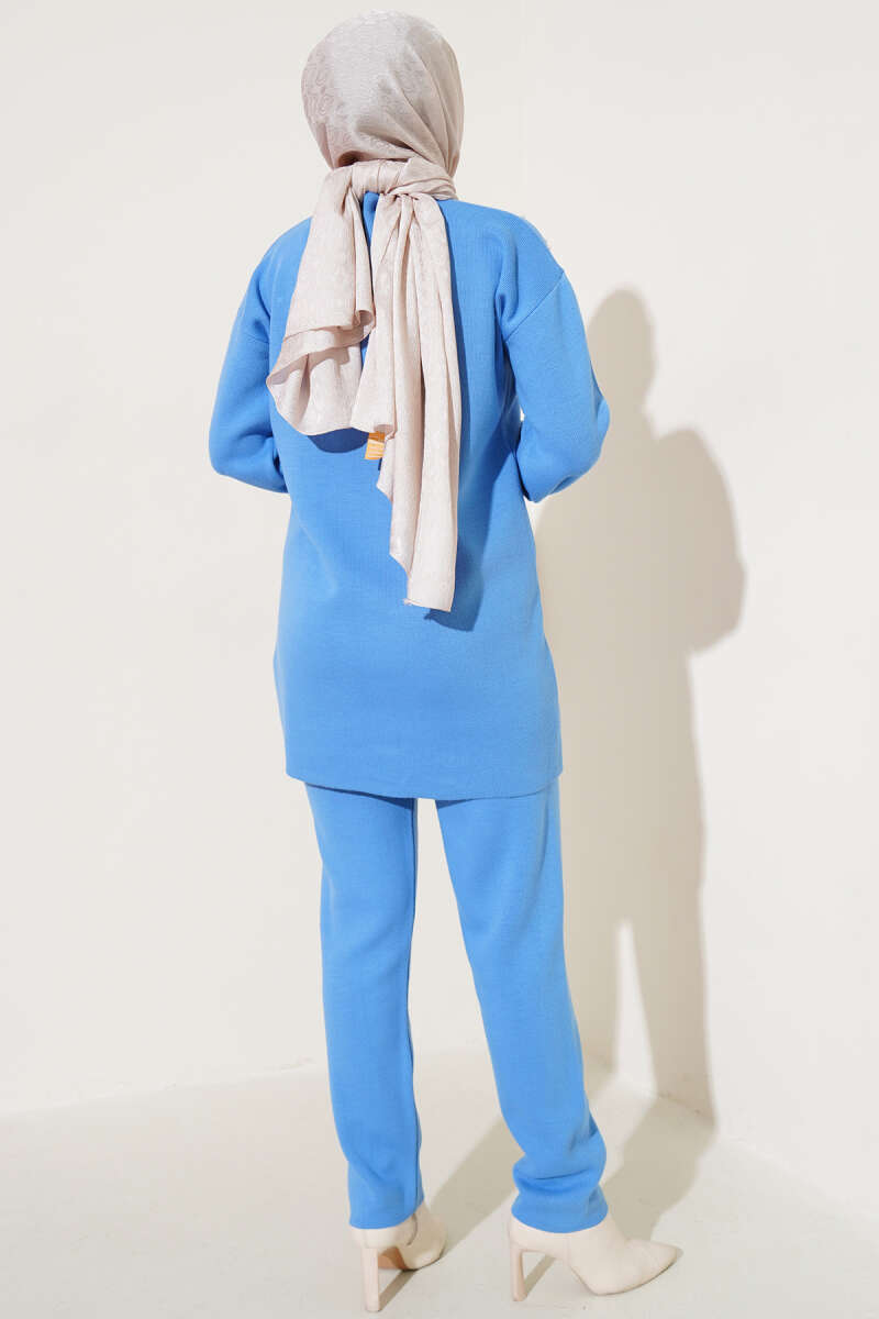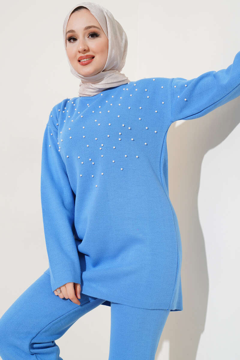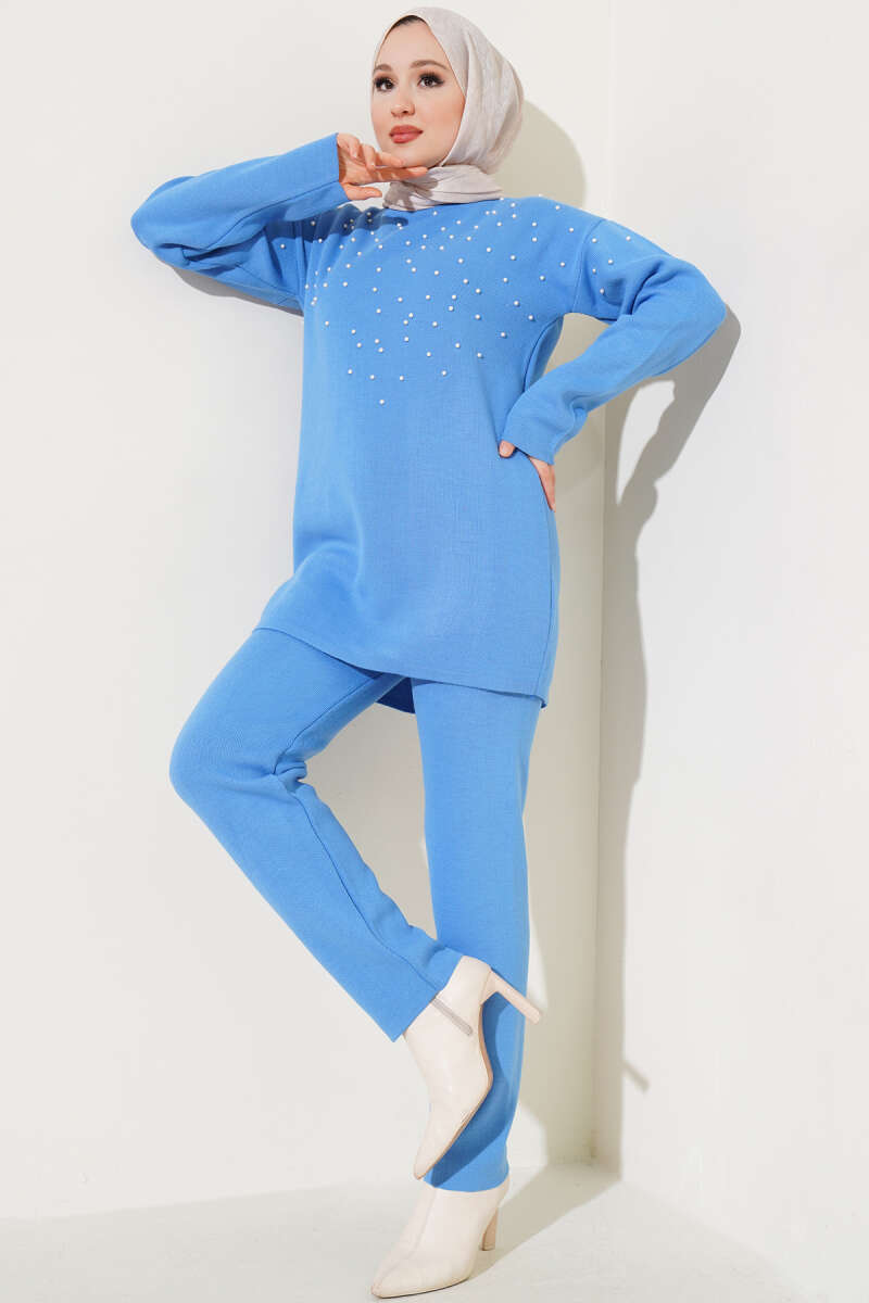 Taşlı Baklava Desen Triko İkili Takım Buz Mavisi