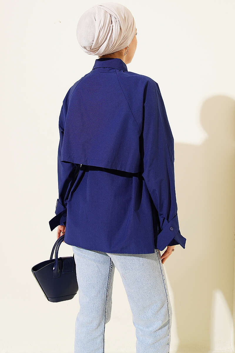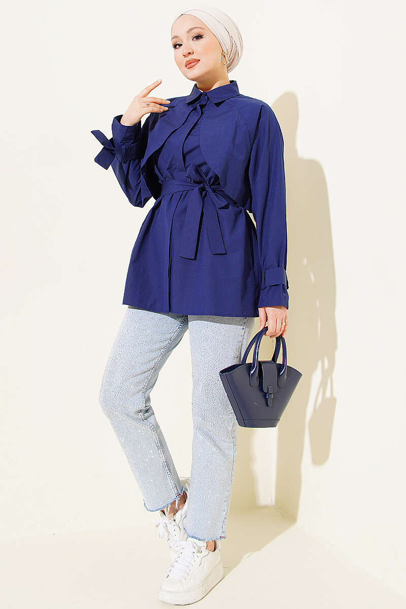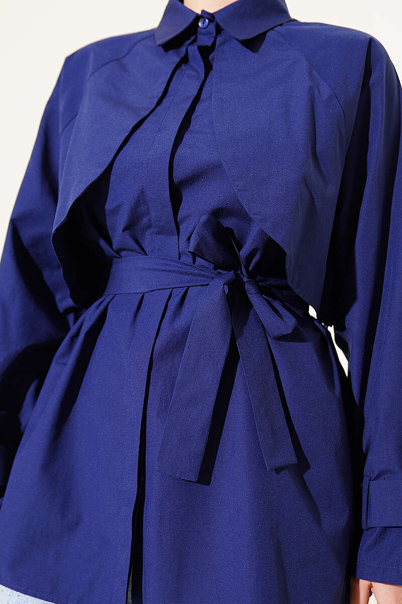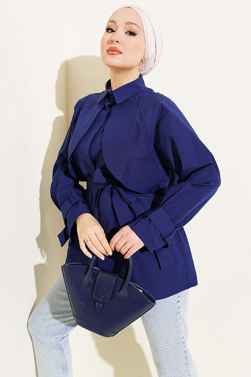 Göğüs Parçalı Kuşaklı Poplin Gömlek Lacivert