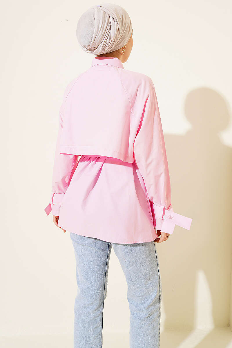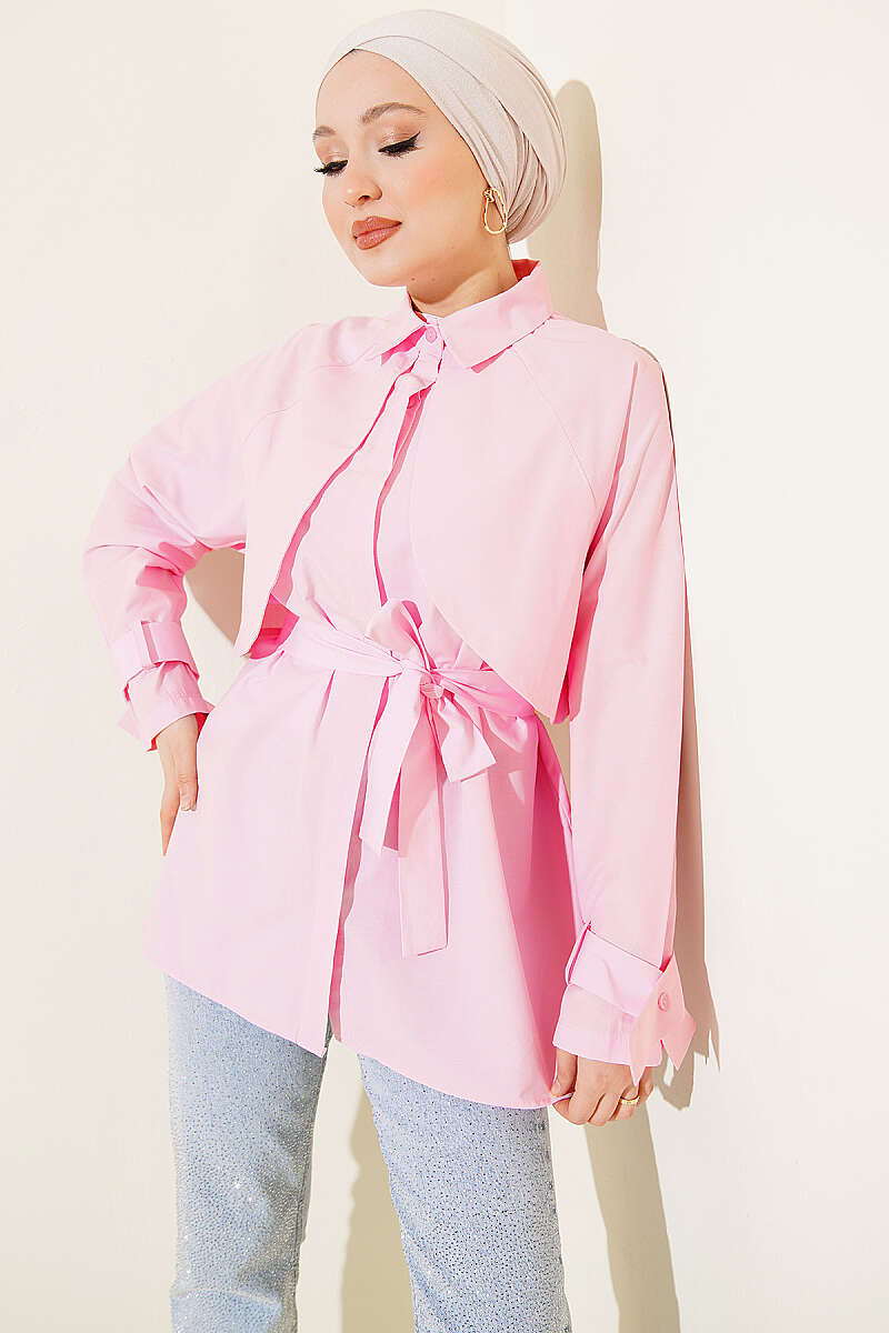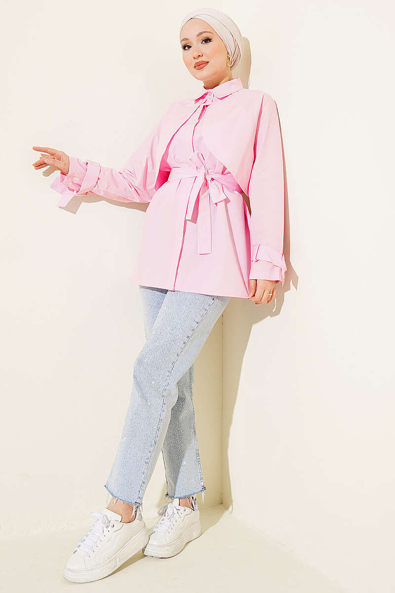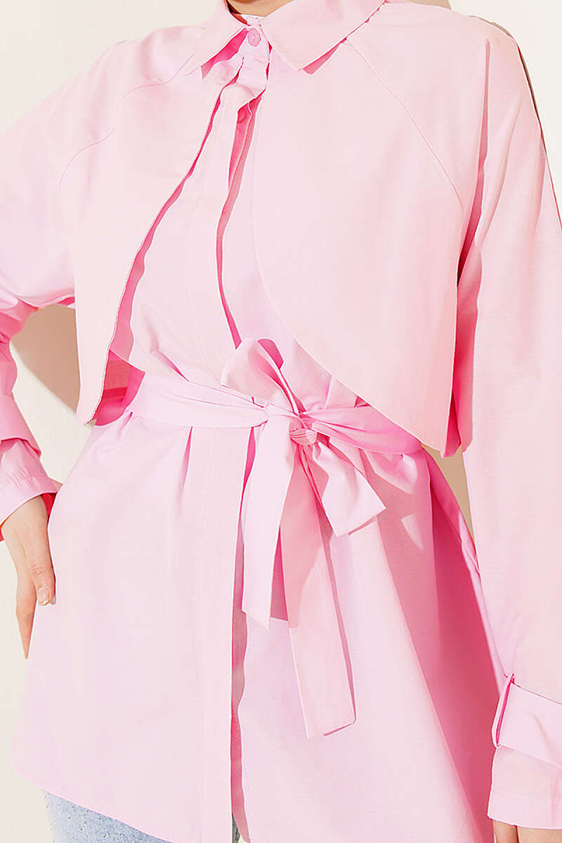 Göğüs Parçalı Kuşaklı Poplin Gömlek Pembe