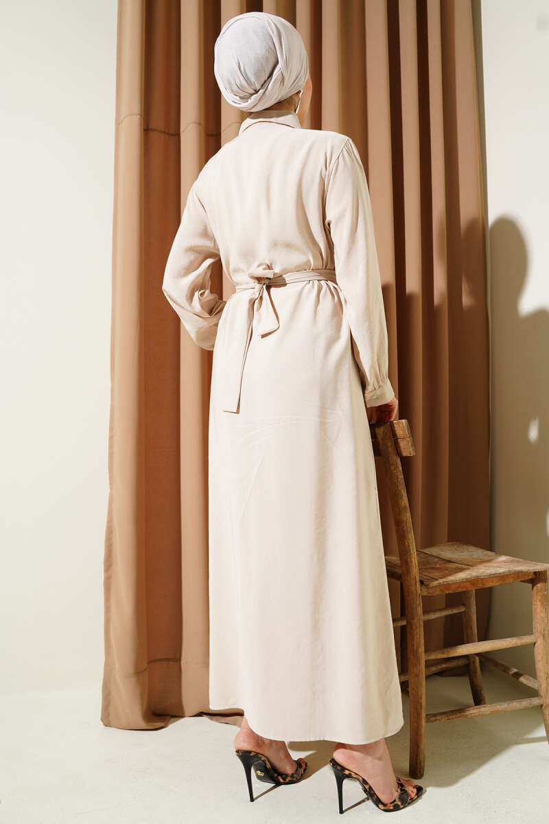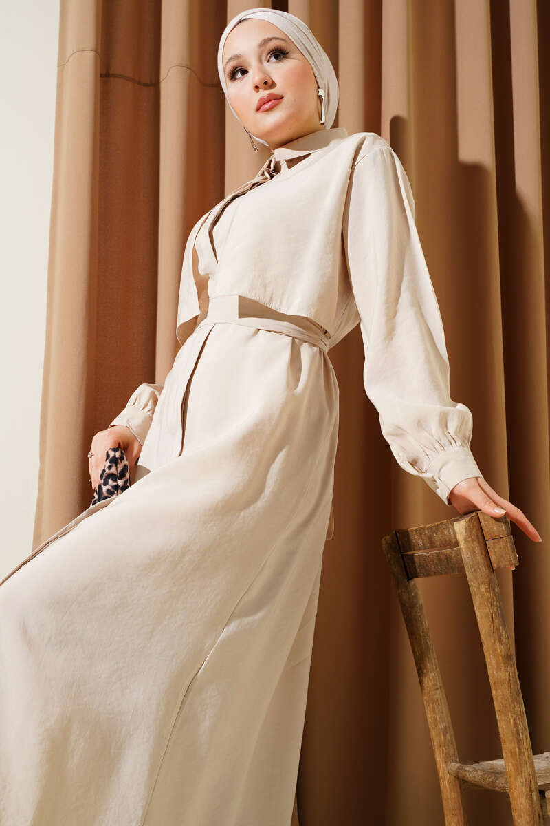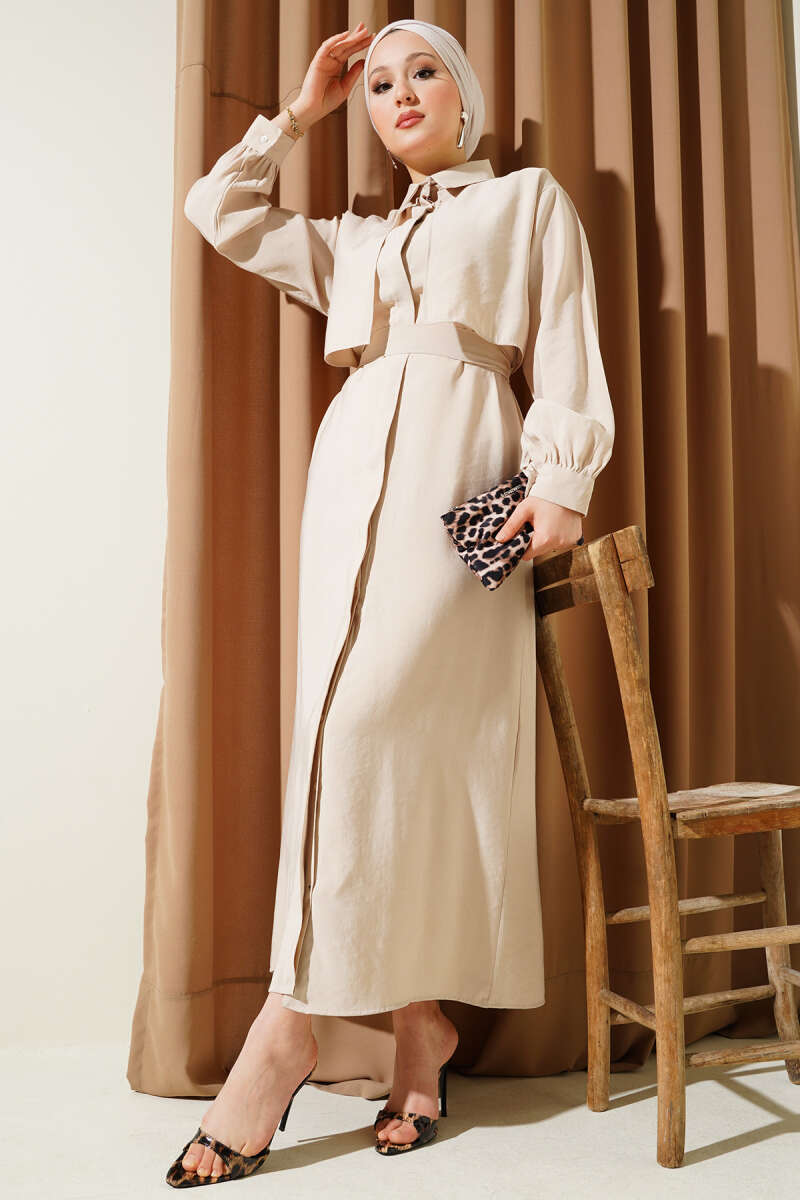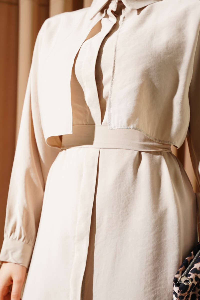 Çizgi Gömlek Garnili Triko Elbise Bej