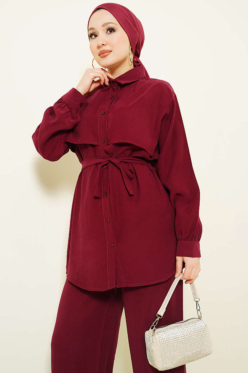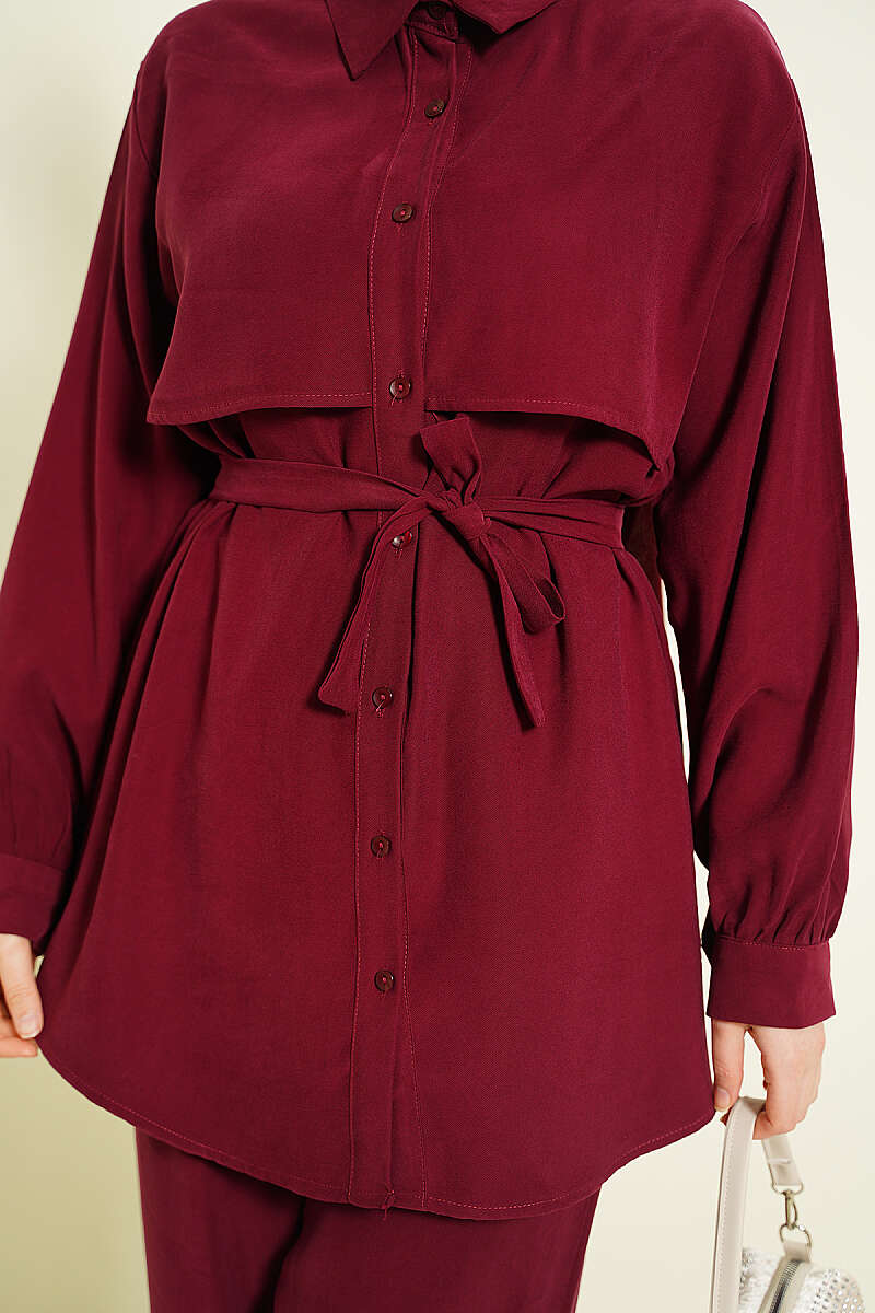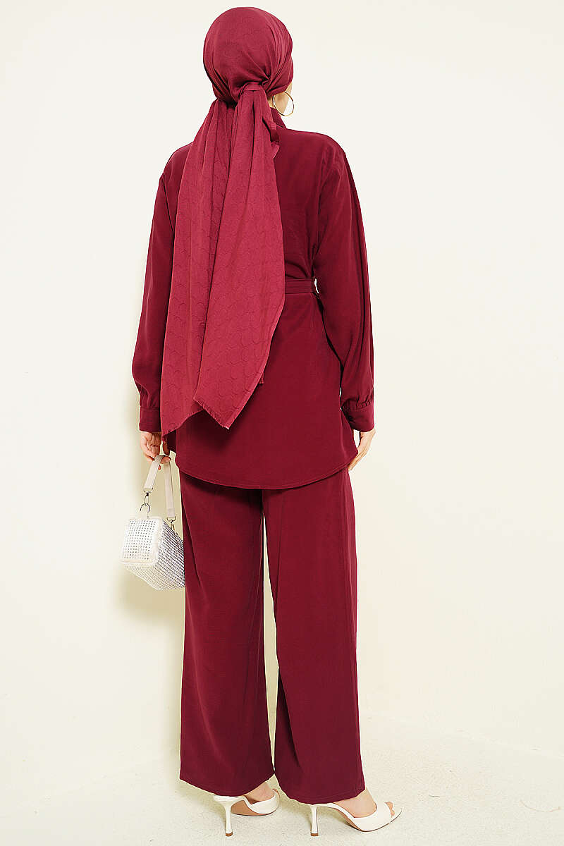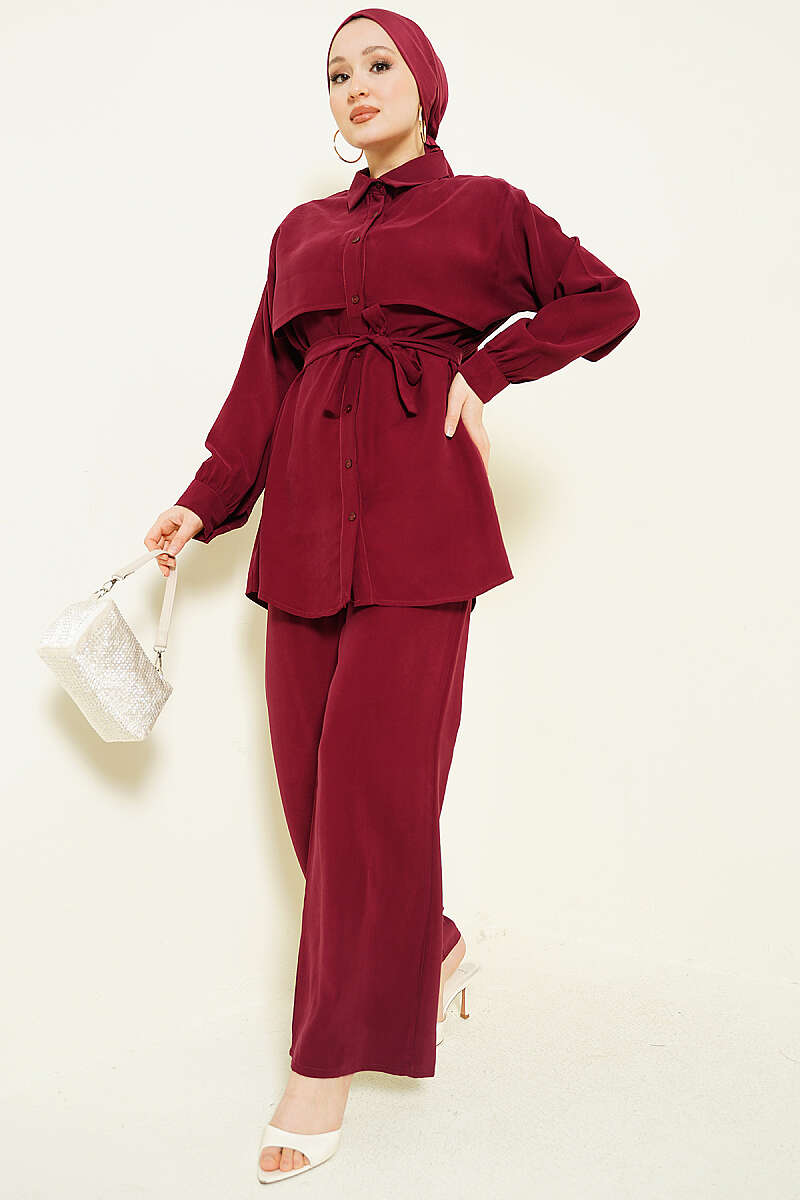 Göğüs Pelerin Kuşaklı Tensel İkili Takım Bordo