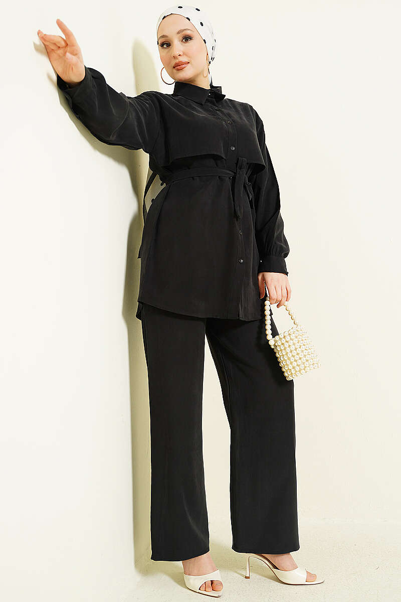 Güprü Detaylı Pelerinli İkili Takım Siyah