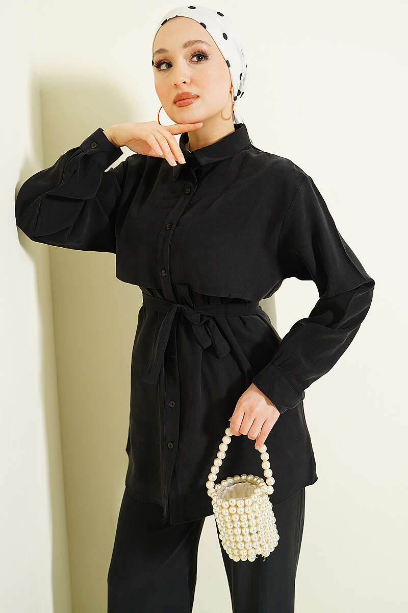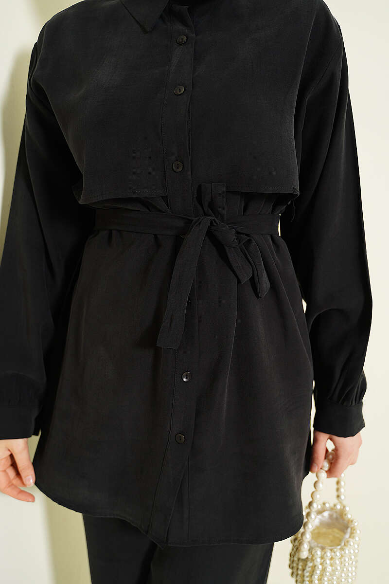 Göğüs Pelerin Kuşaklı Tensel İkili Takım Siyah