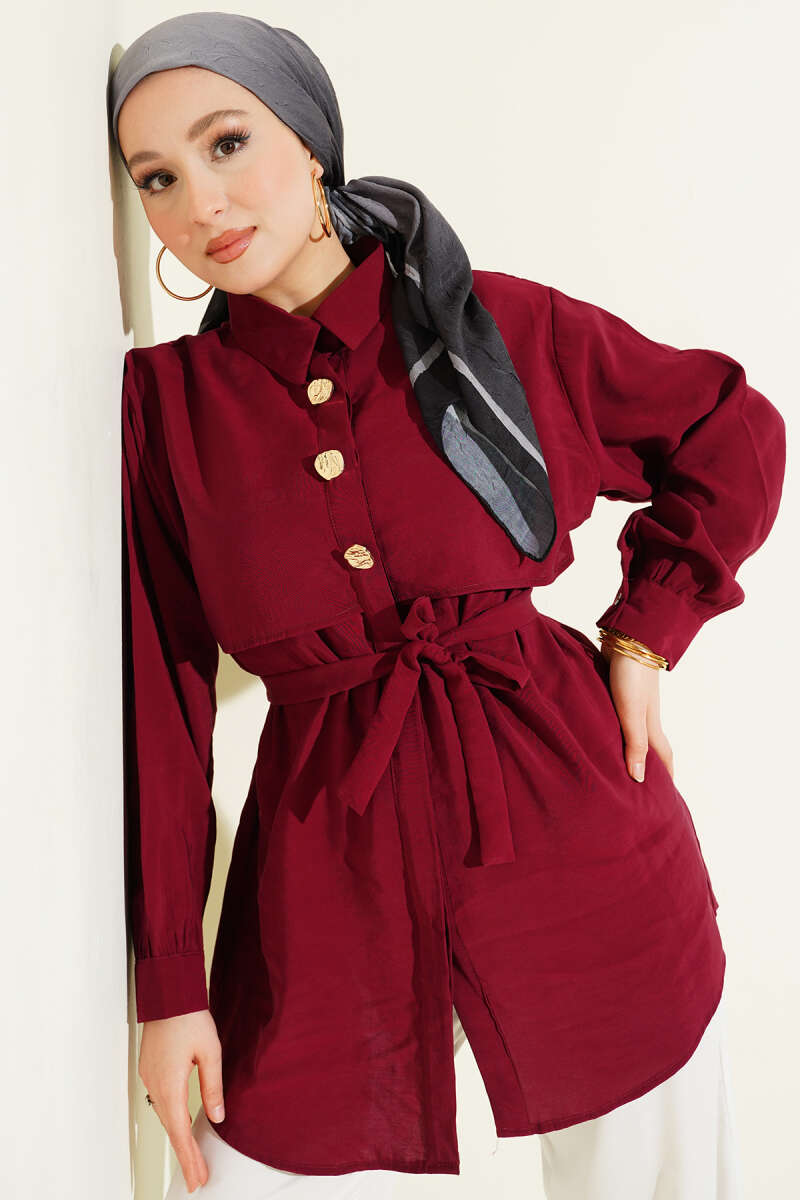 Göğüs Pelerinli Kuşaklı Modal Gömlek Bordo