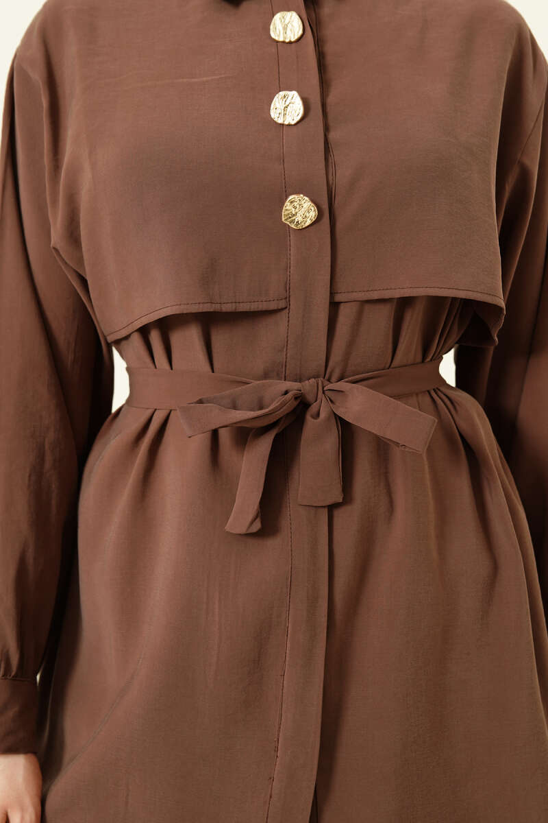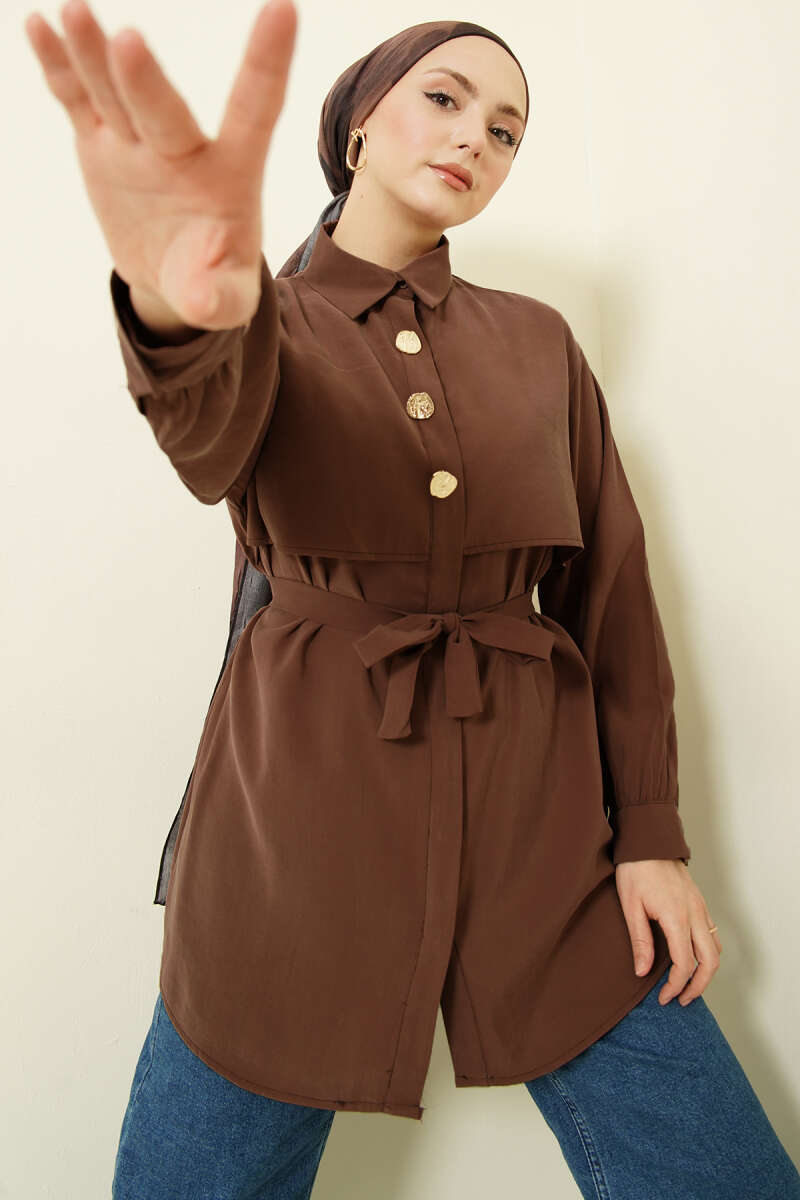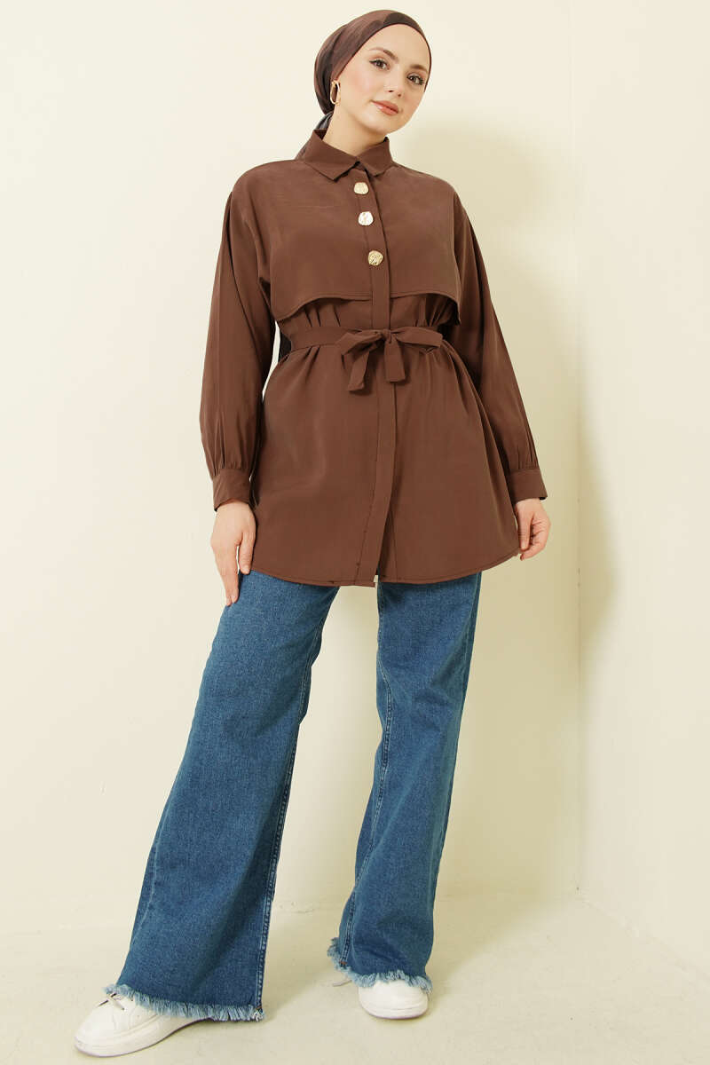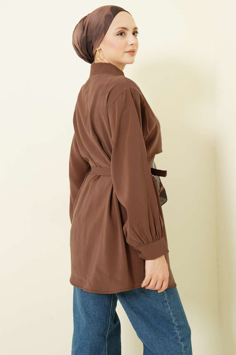 Göğüs Pelerinli Kuşaklı Modal Gömlek Kahve