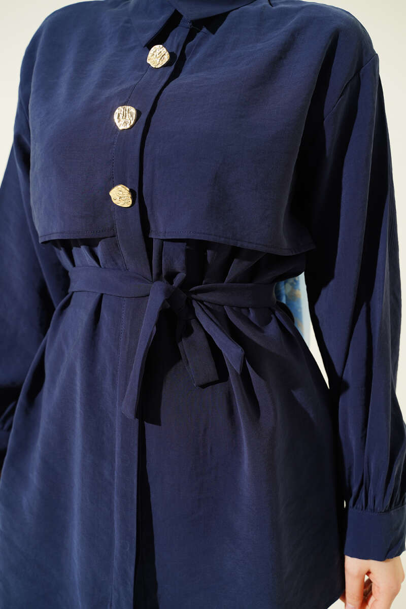 Göğüs Pelerinli Kuşaklı Modal Gömlek Lacivert