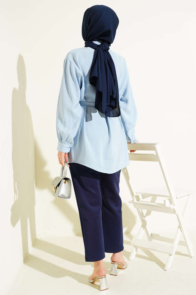 Göğüs Pelerinli Kuşaklı Modal Gömlek Mavi
