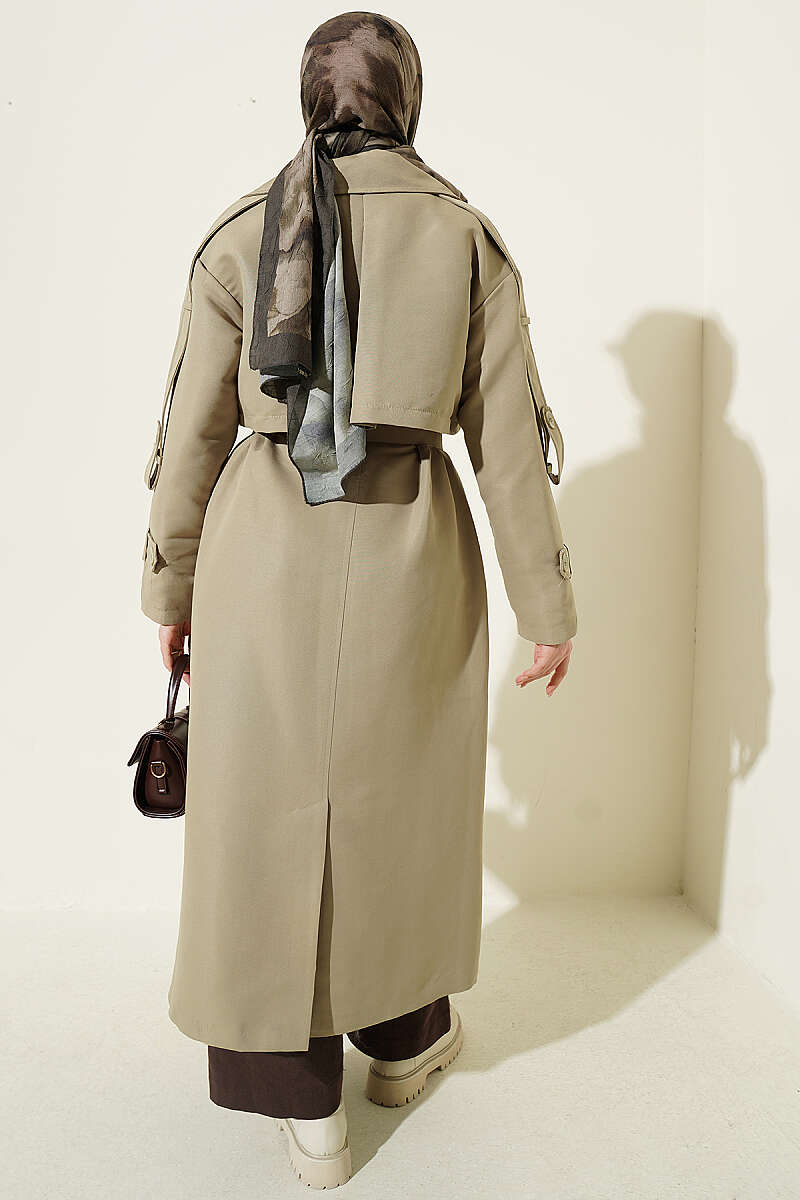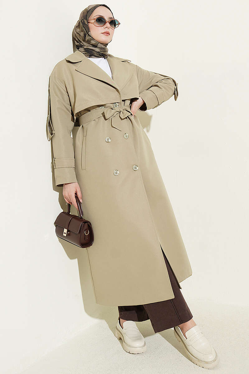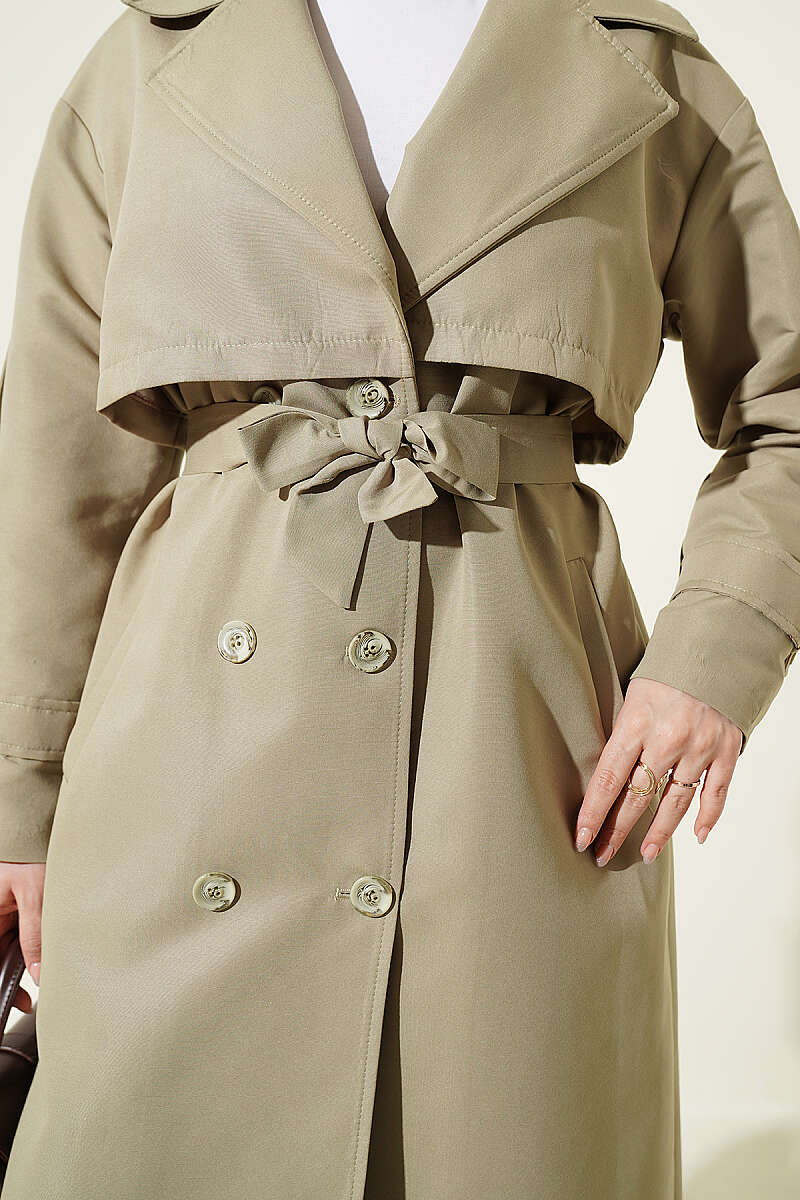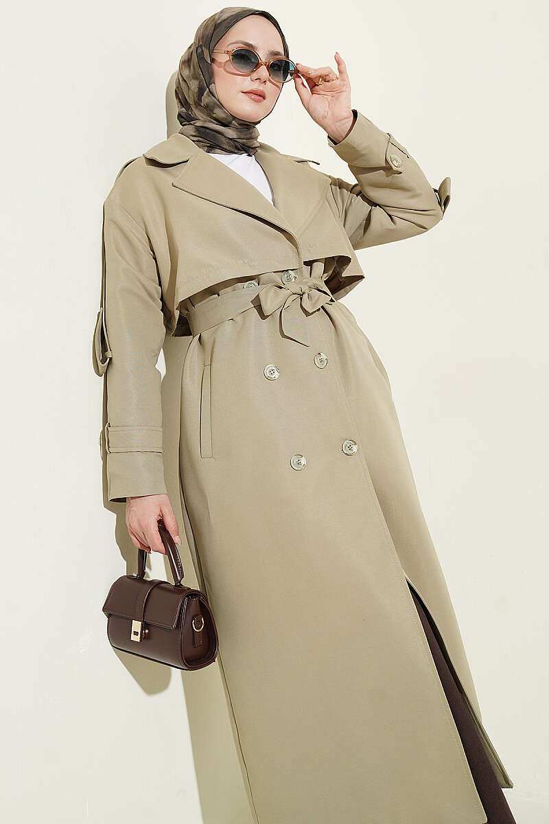 Göğüs Pelerinli Kuşaklı Uzun Trençkot Çağla Yeşili
