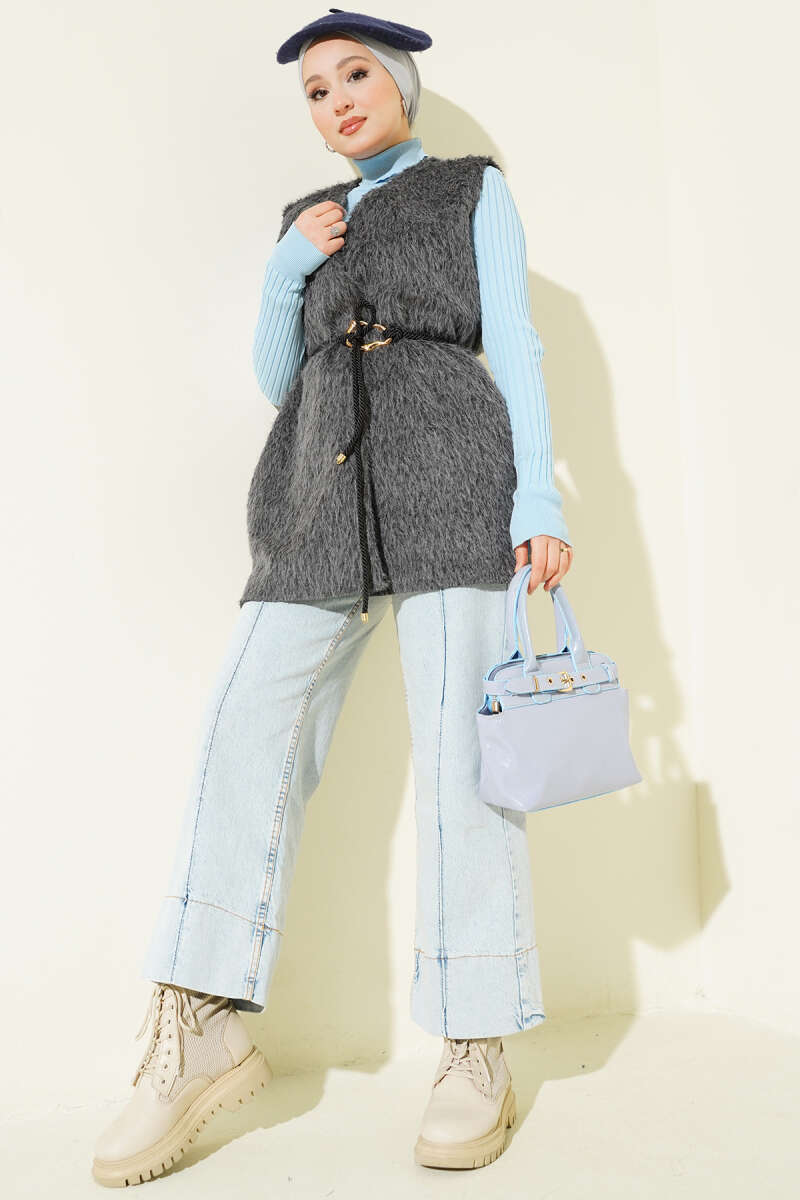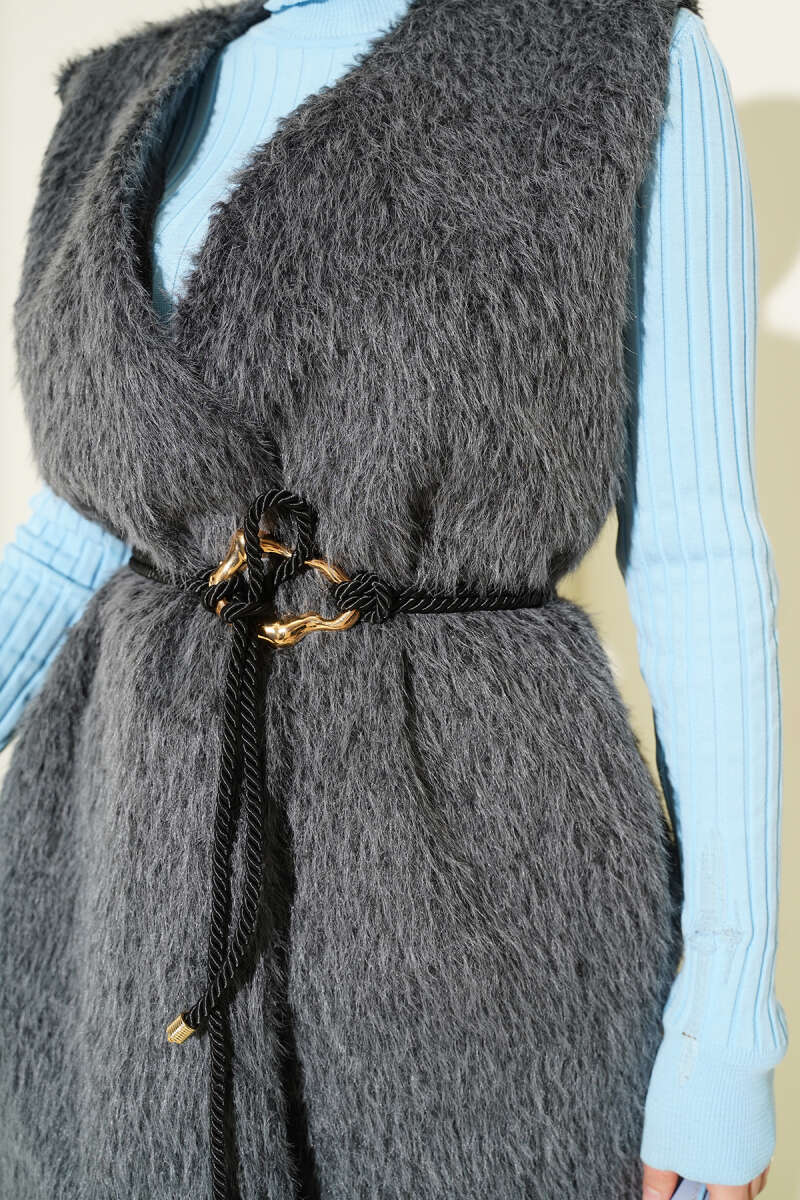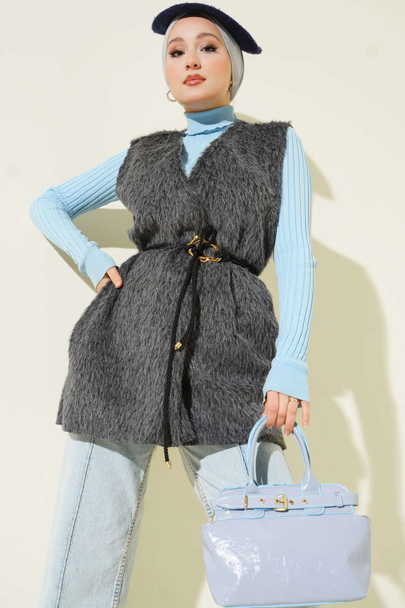Gold Aksesuarlı Kuşaklı Sakallı Yelek Vizon