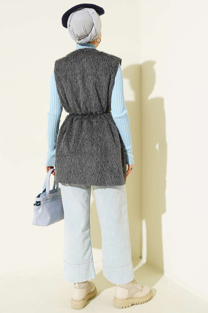 Tek Düğmeli Kemerli Sakallı Yelek Gri
